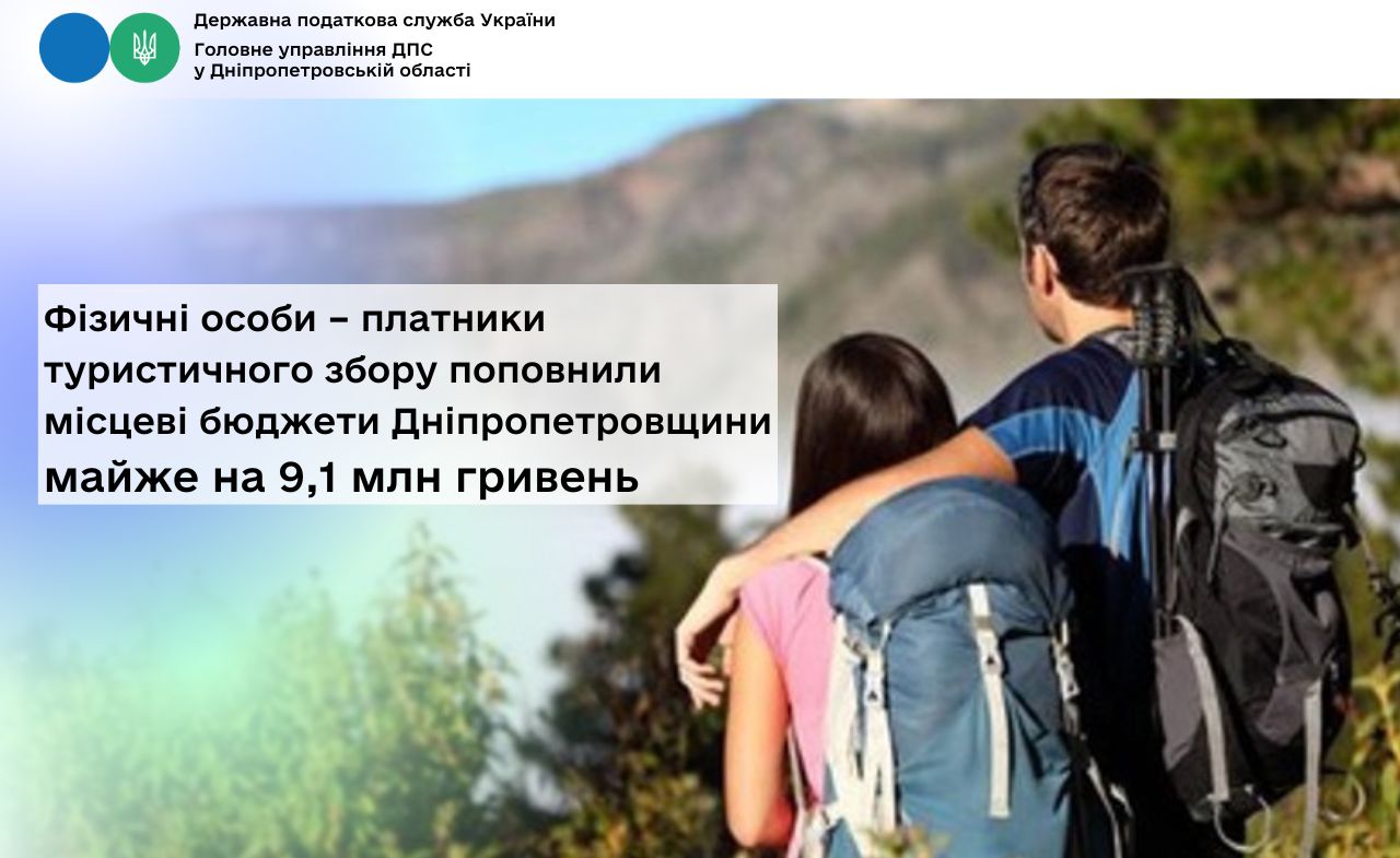 Протягом січня – листопада 2025 року фізичні особи – платники туристичного збору спрямували до місцевих бюджетів Дніпропетровщини майже 9,1 млн гривень. У порівнянні з відповідним періодом 2024 року це майже на 396,0 тис. грн більше, темп росту – 104,6 відсотків.