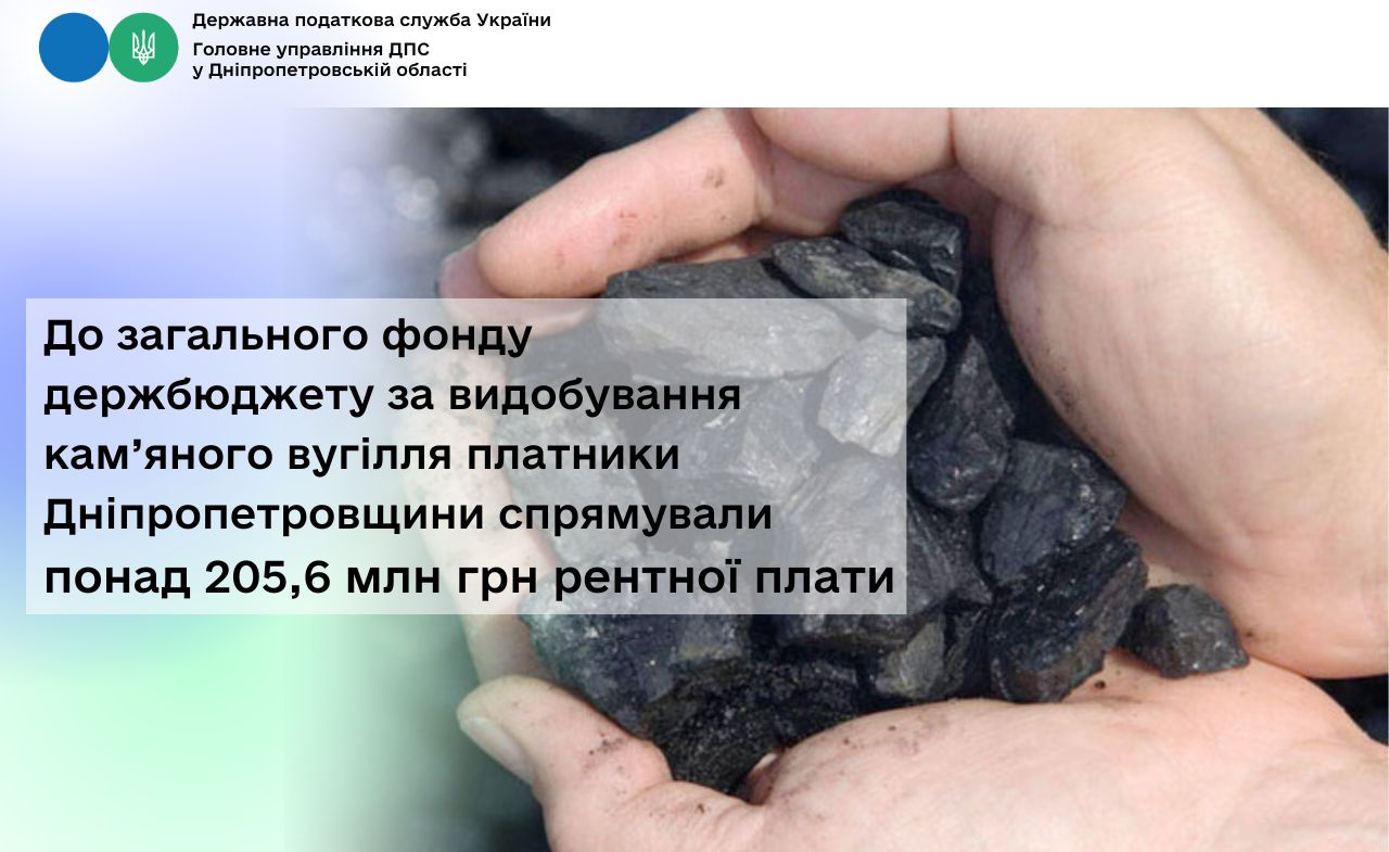 До загального фонду держбюджету за видобування кам’яного вугілля платники Дніпропетровщини спрямували понад 205,6 млн грн рентної плати