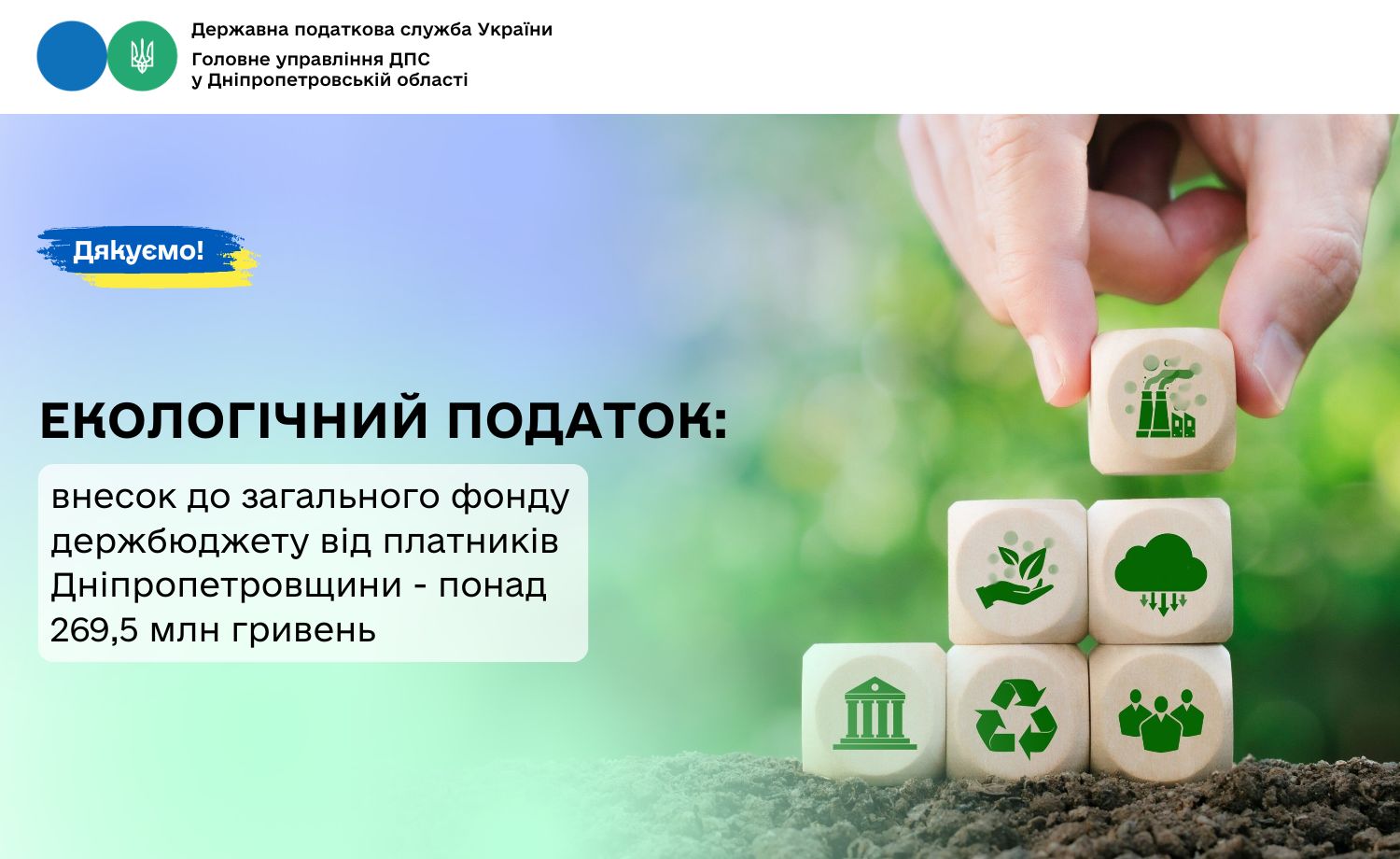 З початку 2025 року до загального фонду державного бюджету платники Дніпропетровщини спрямували понад 269,5 млн грн екологічного податку. У порівнянні з січнем – листопадом минулого року надходження зросли на понад 21,0 млн гривень. Темп росту складає 108,4 відсотків.