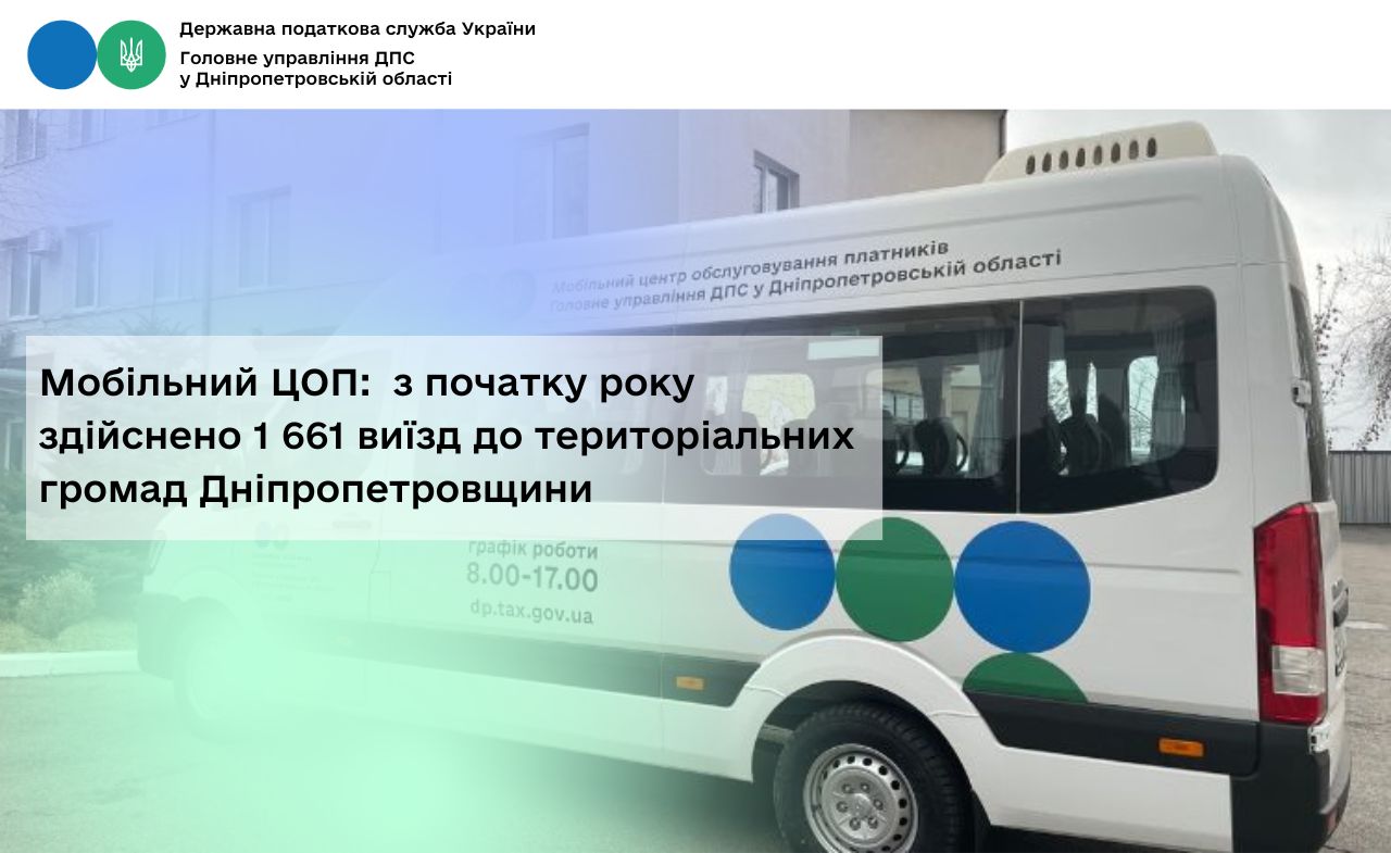 Для більш зручного та якісного надання послуг у Головному управлінні ДПС у Дніпропетровській області працює мобільний центр обслуговування платників (далі – мобільний ЦОП). Мобільний ЦОП започатковано з метою створення комфортних та доступних умов під час отримання адміністративних послуг і сервісів юридичними та фізичними особами у віддалених куточках Дніпропетровської області та вразливими групами населення.
