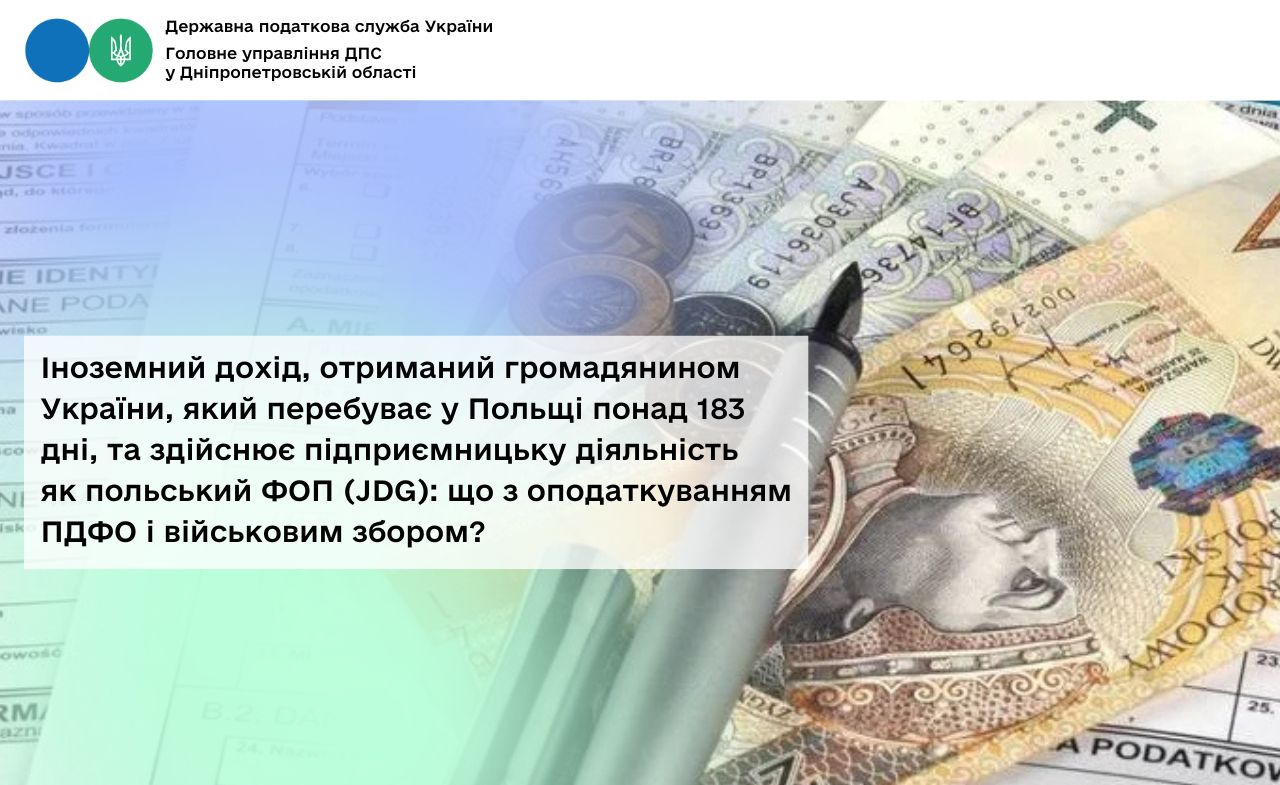 Іноземний дохід, отриманий громадянином України, який перебуває у Польщі понад 183 дні, та здійснює підприємницьку діяльність як польський ФОП (JDG): що з оподаткуванням ПДФО і військовим збором?