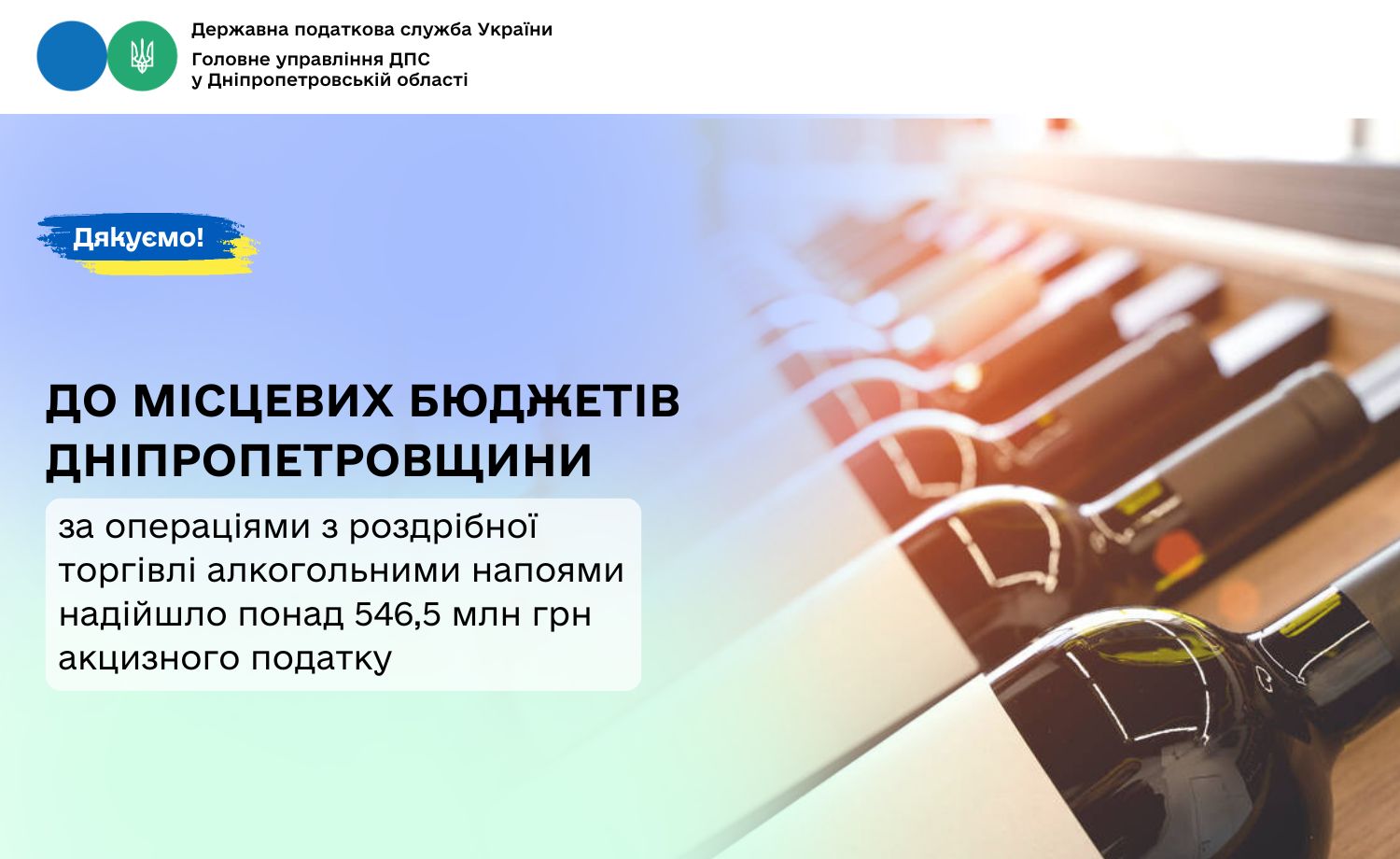 До місцевих бюджетів Дніпропетровщини за операціями з роздрібної торгівлі алкогольними напоями надійшло понад 546,5 млн грн акцизного податку