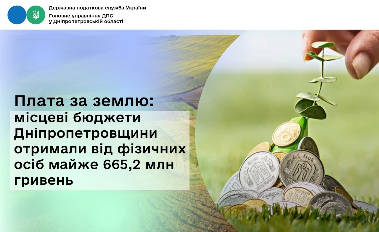 Плата за землю: місцеві бюджети Дніпропетровщини отримали від фізичних осіб майже 665,2 млн гривень