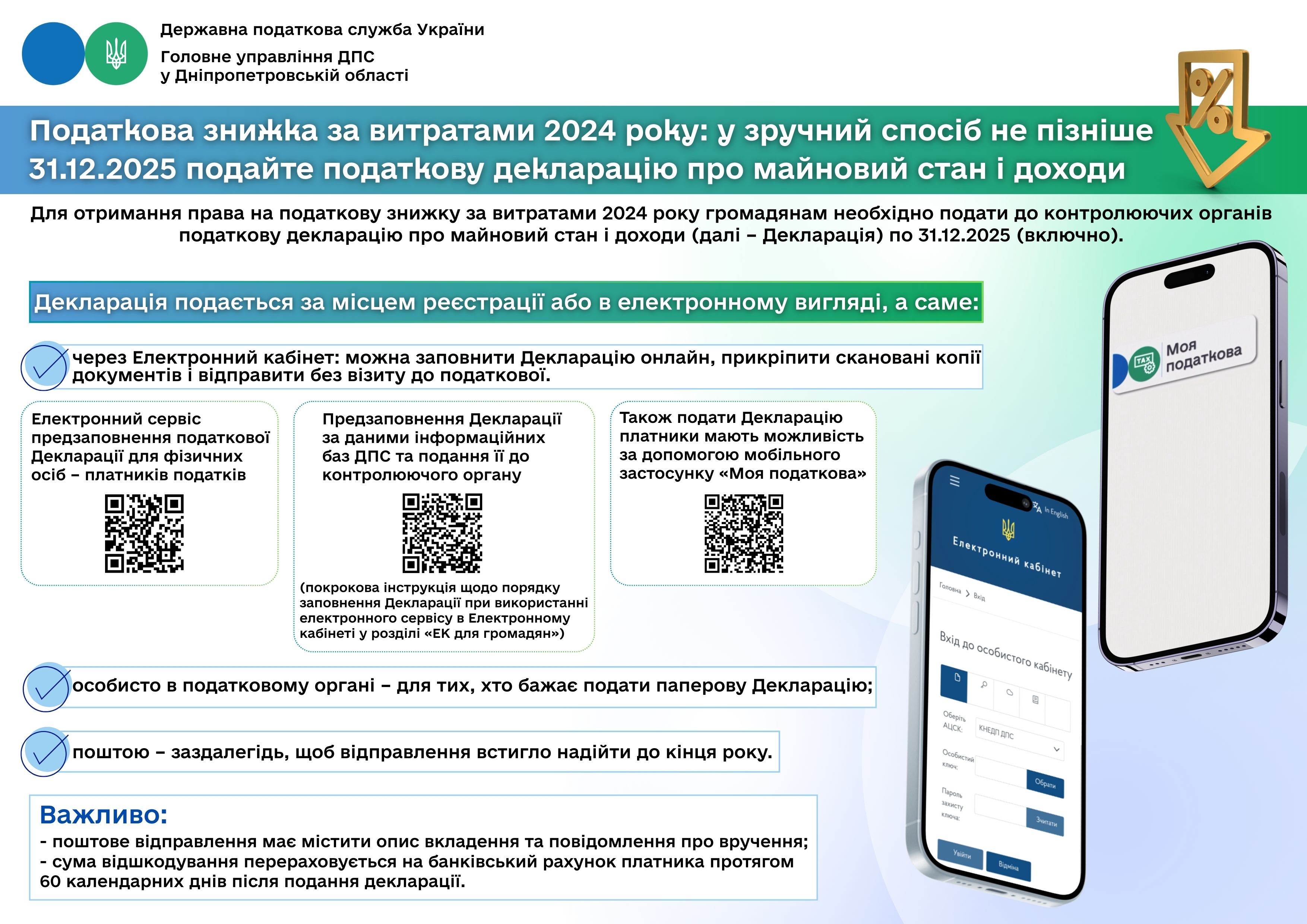 Податкова знижка за витратами 2024 року: у зручний спосіб не пізніше 31.12.2025 подайте податкову декларацію про майновий стан і доходи