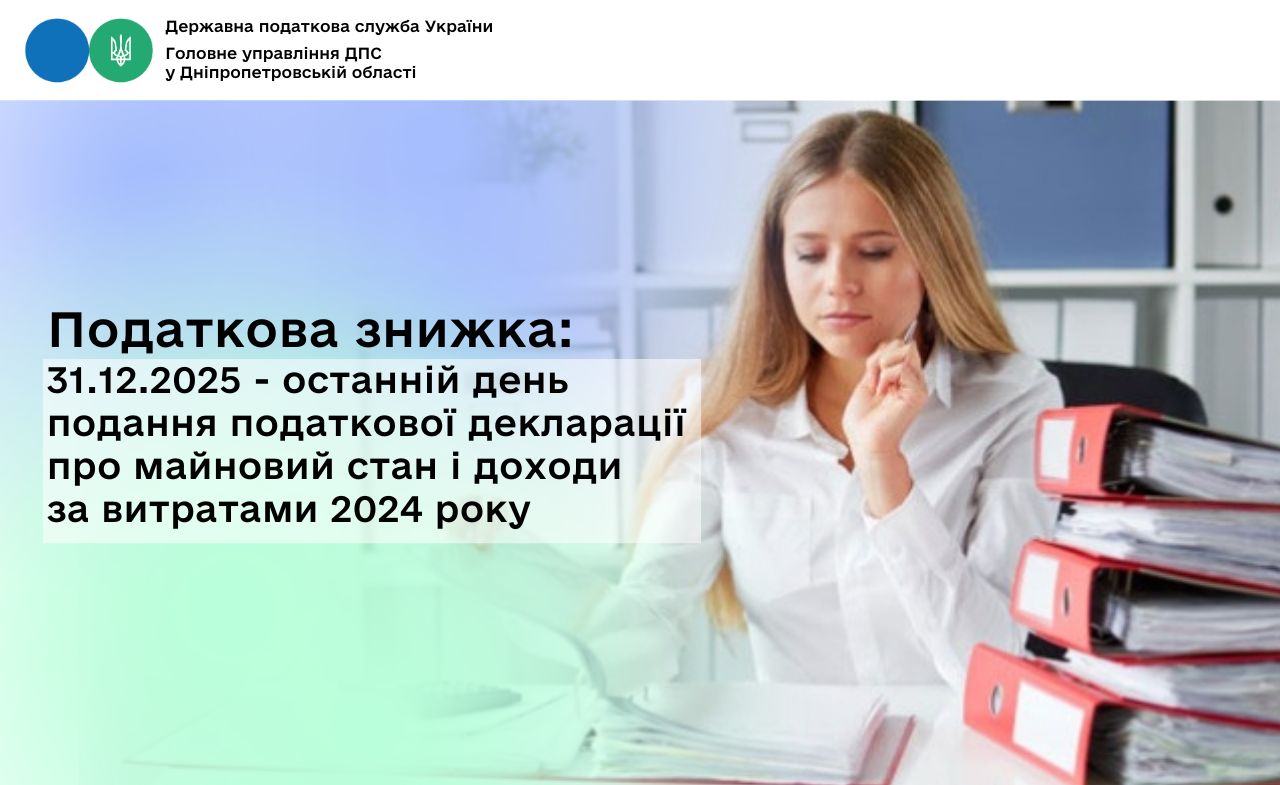 Головне управління ДПС у Дніпропетровській області акцентує увагу, що 31.12.2025 – останній день подання податкової декларації про майновий стан і доходи (далі – Декларація) з метою отримання права на податкову знижку за витратами 2024 року.