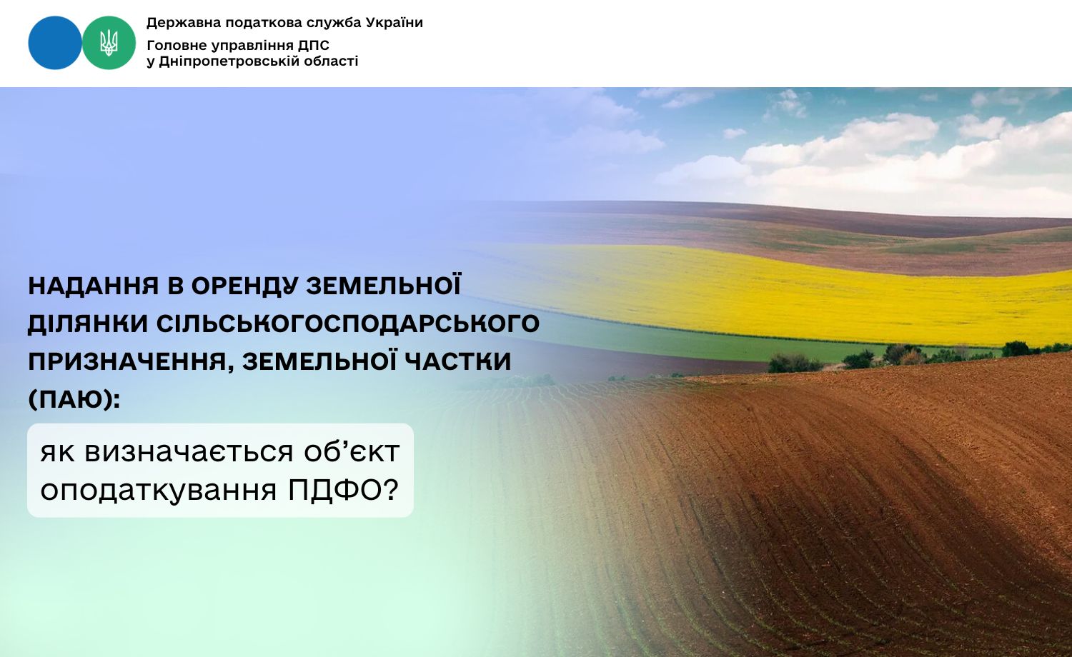 Головне управління ДПС у Дніпропетровській області нагадує, що відповідно до п.п. 170.1.1 п. 170.1 ст. 170 Податкового кодексу України (далі – ПКУ) податковим агентом платника податку – орендодавця щодо його доходу від надання в оренду (емфітевзис) земельної ділянки сільськогосподарського призначення, земельної частки (паю), майнового паю є орендар.