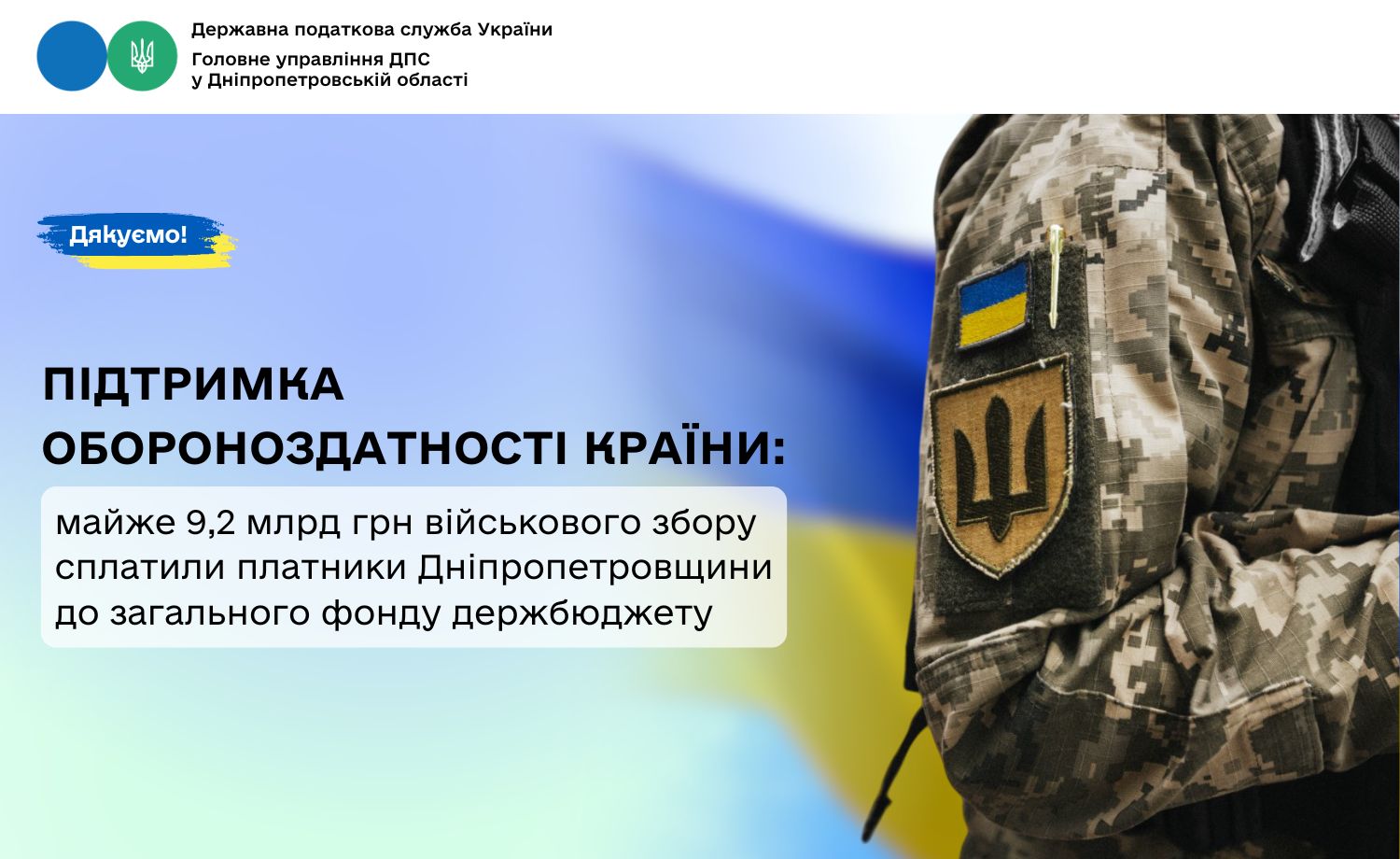 Протягом січня – грудня 2025 року від платників Дніпропетровщини до загального фонду державного бюджету надійшло майже 9,2 млрд грн військового збору. Як повідомив в. о. начальника Головного управління ДПС у Дніпропетровській області Юрій Павлютін, у порівнянні з відповідним періодом 2024 року надходження збільшились майже на 6,3 млрд гривень.
