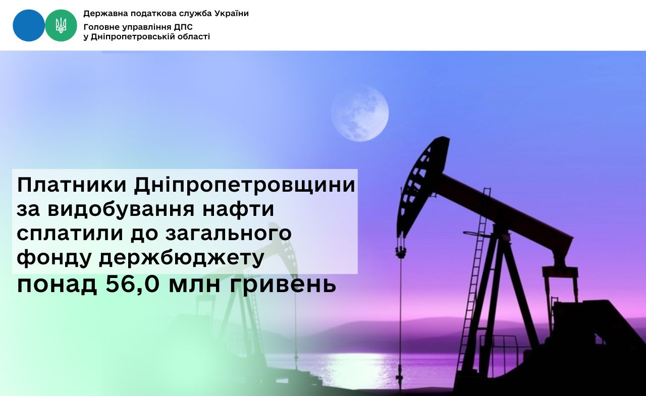 Платники Дніпропетровщини за видобування нафти сплатили до загального фонду держбюджету понад 56,0 млн гривень