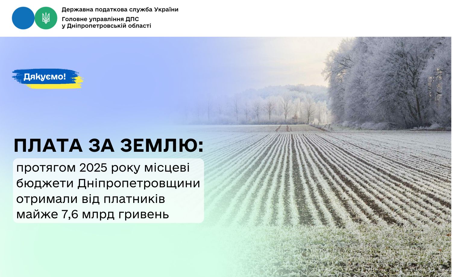 Плата за землю: протягом 2025 року місцеві бюджети Дніпропетровщини отримали від платників майже 7,6 млрд гривень