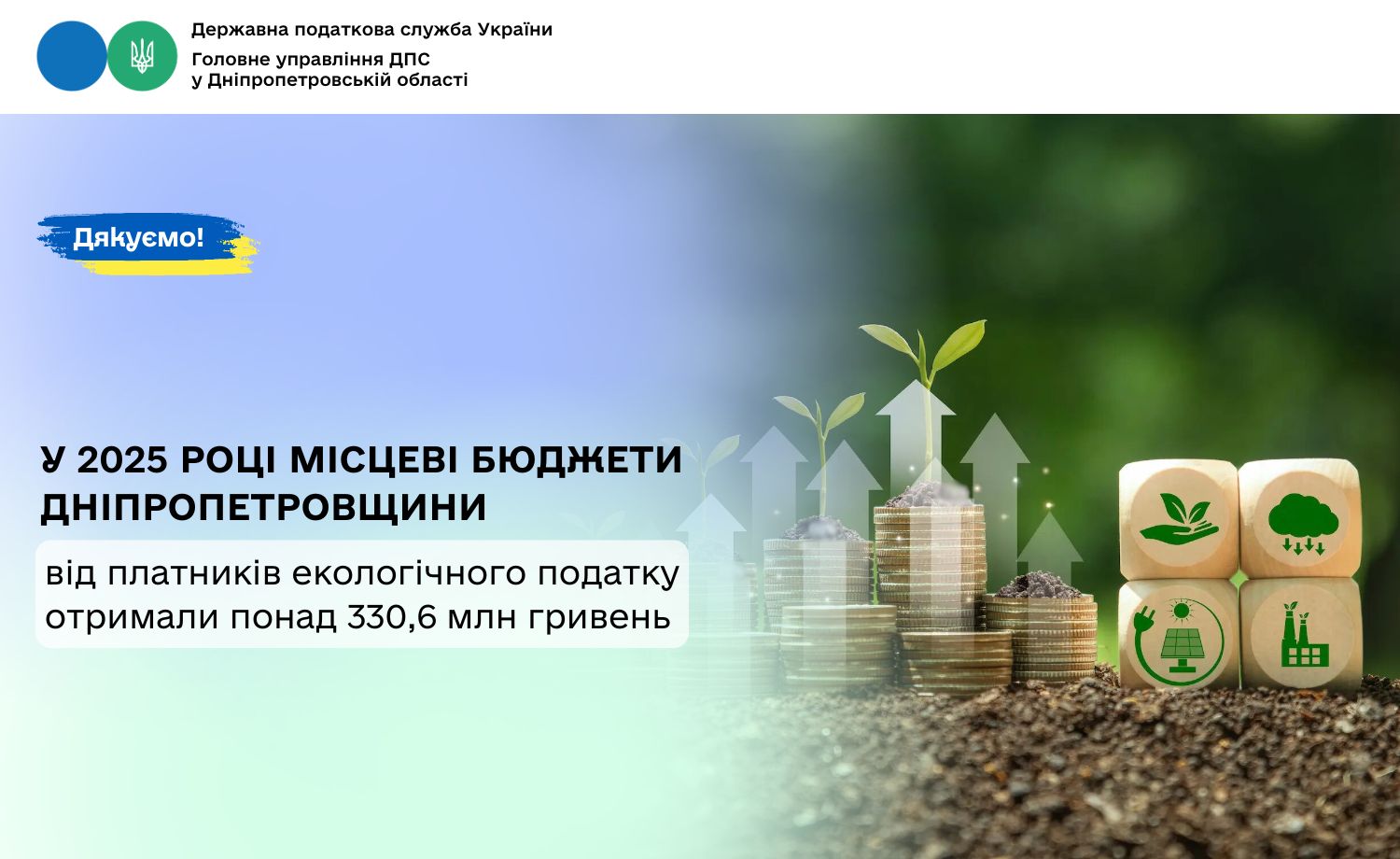 Протягом 2025 року від платників екологічного податку до місцевих бюджетів Дніпропетровщини надійшло понад 330,6 млн гривень. Як повідомив в. о. начальника Головного управління ДПС у Дніпропетровській області Юрій Павлютін, у порівнянні з січнем – груднем 2024 року надходження зросли на понад 19,4 млн гривень.