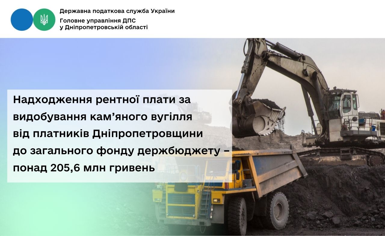 У січні – грудні 2025 року платники Дніпропетровської області за видобування кам’яного вугілля спрямували до загального фонду державного бюджету майже понад 205,6 млн грн рентної плати.