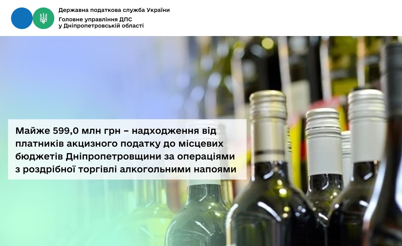 Протягом січня – грудня 2025 року платники Дніпропетровської області за операціями з роздрібної торгівлі алкогольними напоями платники спрямували до місцевих бюджетів Дніпропетровщини майже 599,0 млн грн акцизного податку. Надходження зросли на понад 37,7 млн грн, темп росту – 106,7 відсотків.