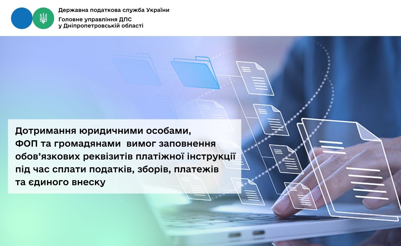 Дотримання юридичними особами, ФОП та громадянами вимог заповнення обов’язкових реквізитів платіжної інструкції під час сплати податків, зборів, платежів та єдиного внеску