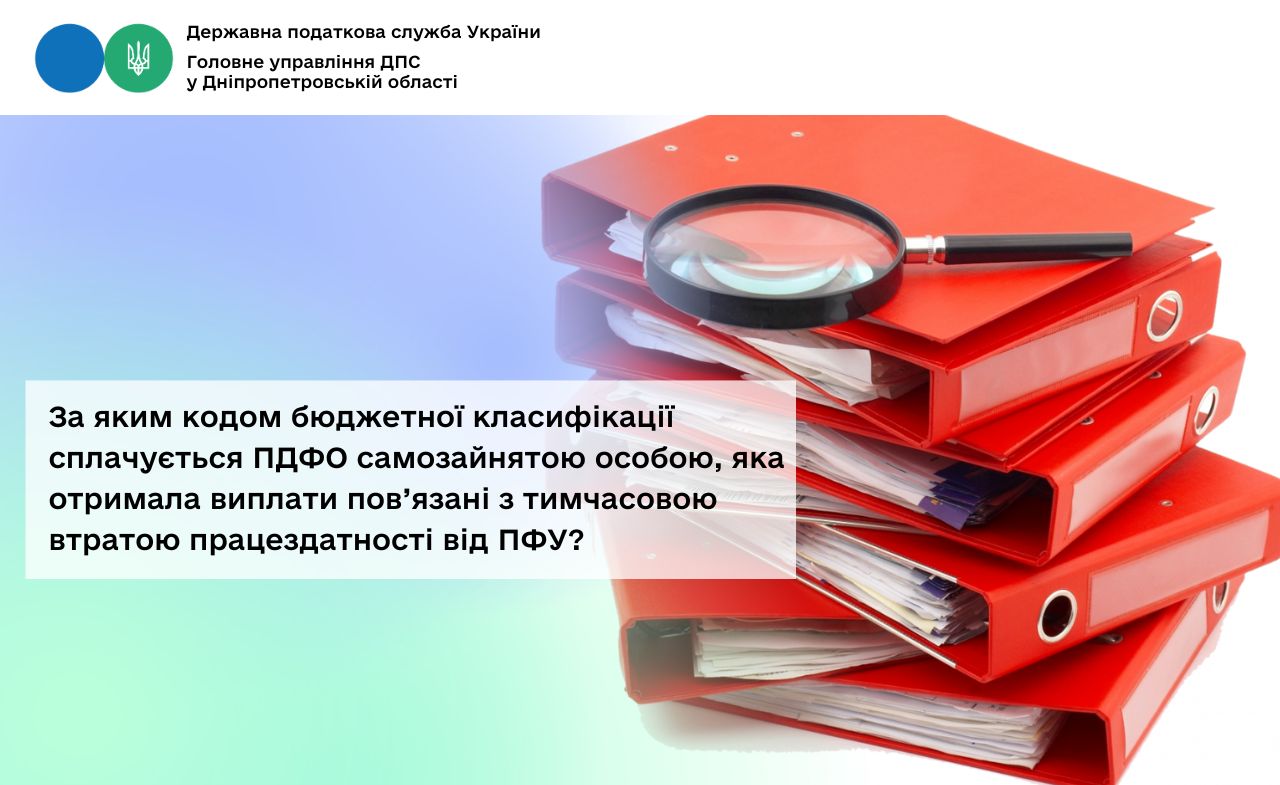 Враховуючи викладене, податок на доходи фізичних осіб сплачується самозайнятою особою, яка отримала виплати пов’язані з тимчасовою втратою працездатності від ПФУ, за кодом класифікації доходів бюджету – 11010400.
