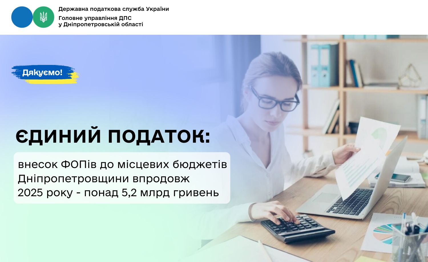Протягом січня – грудня 2025 року місцеві бюджети Дніпропетровщини отримали від фізичних осіб – підприємців (ФОП) майже 5 226,9 млн грн єдиного податку. Порівнюючи з 2024 роком, сума надходжень збільшилася на 531 млн грн, або на 11,3 відсотки. Про це проінформував в. о. начальника Головного управління ДПС у Дніпропетровській області Юрій Павлютін.