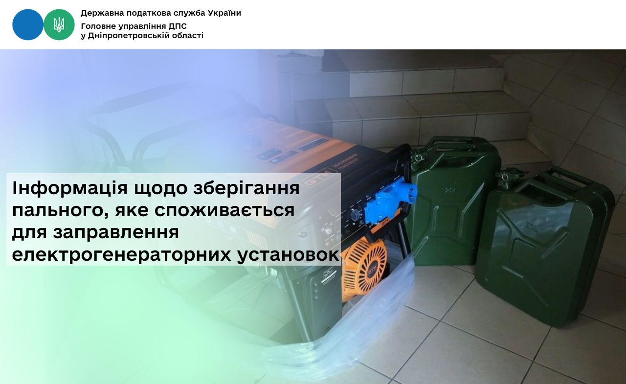 Головне управління ДПС у Дніпропетровській області звертає увагу, що відповідно до п. 24 розд. ХІІІ «Перехідні положення» Закону України від 18 червня 2024 року № 3817-ІХ «Про державне регулювання виробництва і обігу спирту етилового, спиртових дистилятів, біоетанолу, алкогольних напоїв, тютюнових виробів, тютюнової сировини, рідин, що використовуються в електронних сигаретах, та пального» (із змінами) (далі – Закон № 3817) встановлено, що на період воєнного стану в Україні, та протягом 30 днів з дня його припинення або скасування суб’єкт господарювання має право зберігати пальне, яке споживається для заправлення електрогенераторної установки в обсязі до 2 000 літрів на кожному об’єкті, що забезпечений електрогенераторною установкою, без отримання дозвільних документів (документів дозвільного характеру, ліцензії на право зберігання пального, результатів надання інших адміністративних послуг).