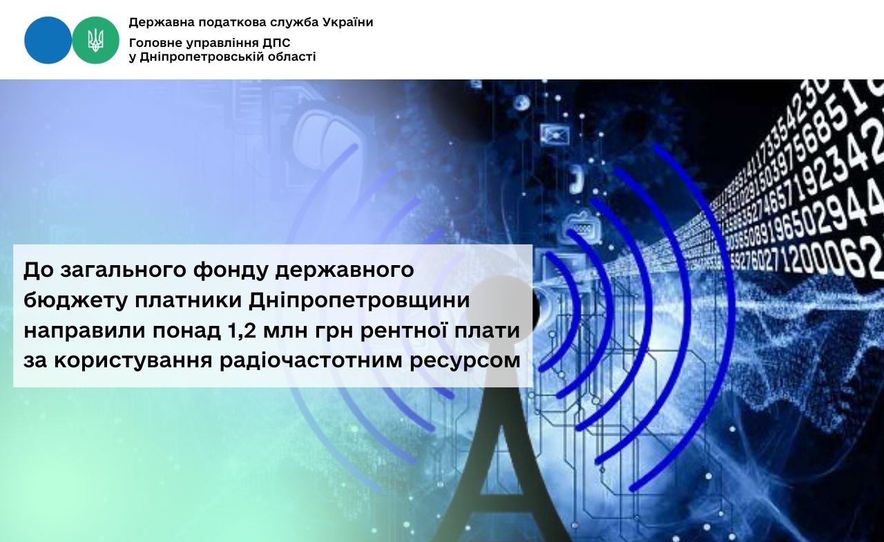 Впродовж минулого року платники Дніпропетровщини спрямували до загального фонду державного бюджету понад 1,2 млн грн грн рентної плати за користування радіочастотним спектром (радіочастотним ресурсом) України (рентна плата за користування радіочастотним ресурсом)