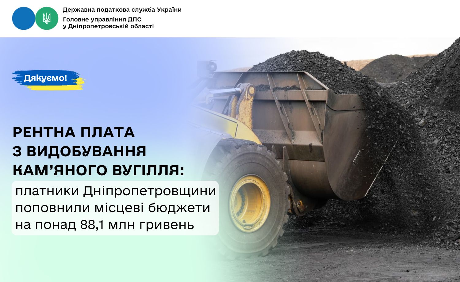 Рентна плата з видобування кам’яного вугілля: платники Дніпропетровщини поповнили місцеві бюджети на понад 88,1 млн гривень