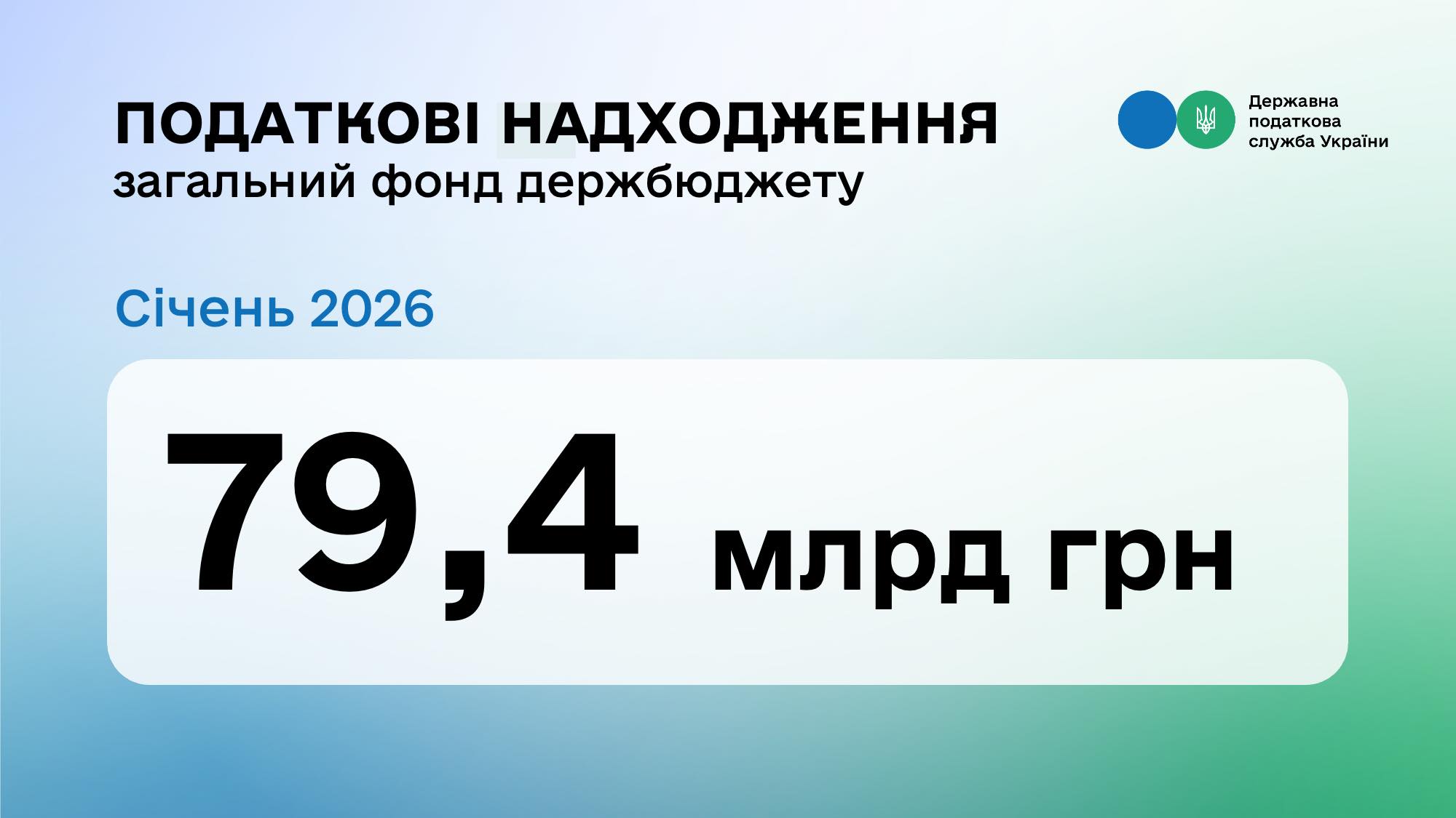 До загального фонду держбюджету у січні 2026 року  надійшло 79,4 млрд грн (91,8 % плану) податків та зборів, які контролює ДПС. Про це на своїй сторінці у Facebook повідомила в. о. Голови ДПС Леся Карнаух