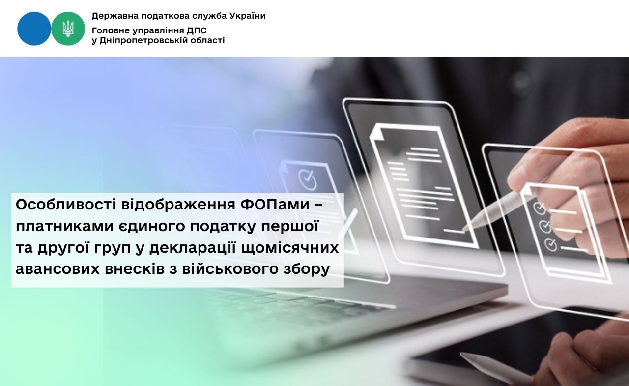 Головне управління ДПС у Дніпропетровській області звертає увагу, що відповідно до п.п. 2 п.п. 1.1 п. 16 прим. 1 підрозд. 10 розд. XX «Перехідні положення» Податкового кодексу України (далі – ПКУ) платниками військового збору є фізичні особи – підприємці – платники єдиного податку першої, другої та четвертої групи.