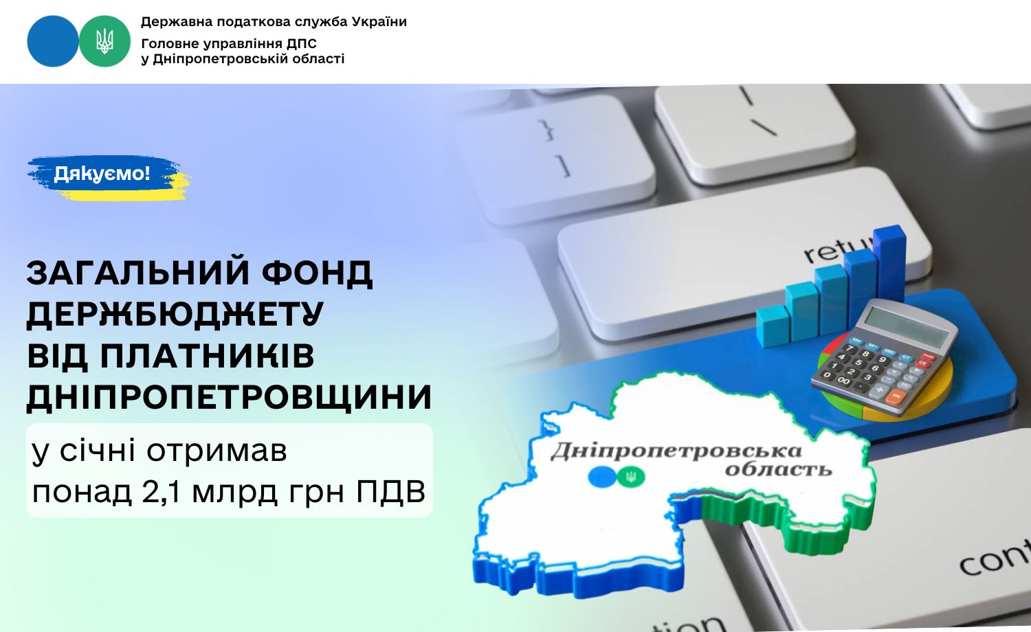 Загальний фонд держбюджету від платників Дніпропетровщини у січні отримав понад 2,1 млрд грн ПДВ