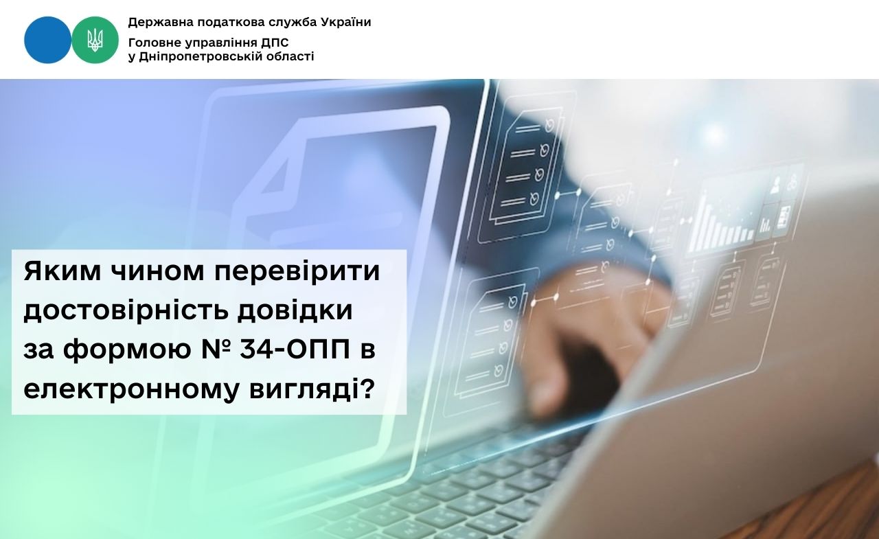 Головне управління ДПС у Дніпропетровській області звертає увагу, що відповідно до п. 9.4 розд. ІХ Порядку обліку платників податків і зборів, затвердженого наказом Міністерства фінансів України від 09.12.2011 № 1588 (зі змінами) (далі – Порядок № 1588) у разі потреби платник податків може отримати дублікат або копію довідки про взяття на облік платника податків, відомості щодо якого не підлягають включенню до Єдиного державного реєстру юридичних осіб, фізичних осіб – підприємців та громадських формувань (далі – ЄДР) за формою № 34-ОПП (далі – Довідка за ф. № 34-ОПП), подавши запит про надання довідки про взяття на облік платника податків, відомості щодо якого не підлягають включенню до ЄДР за формою № 34-ОПН (далі – Запит за ф. № 34-ОПН), наведеною у додатку 11 до Порядку № 1588, зокрема, через Електронний кабінет в електронній формі з дотриманням вимог законів України від 22 травня 2003 року № 851-IV «Про електронні документи та електронний документообіг» (зі змінами та доповненнями) (далі – Закон № 851) та від 05 жовтня 2017 року № 2155-VIII «Про електронну ідентифікацію та електронні довірчі послуги» (зі змінами та доповненнями) (далі – Закон № 2155).