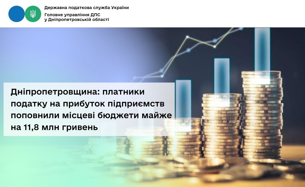 У січні 2026 року місцеві бюджети Дніпропетровщини отримали від платників податку на прибуток підприємств майже 11,8 млн гривень.