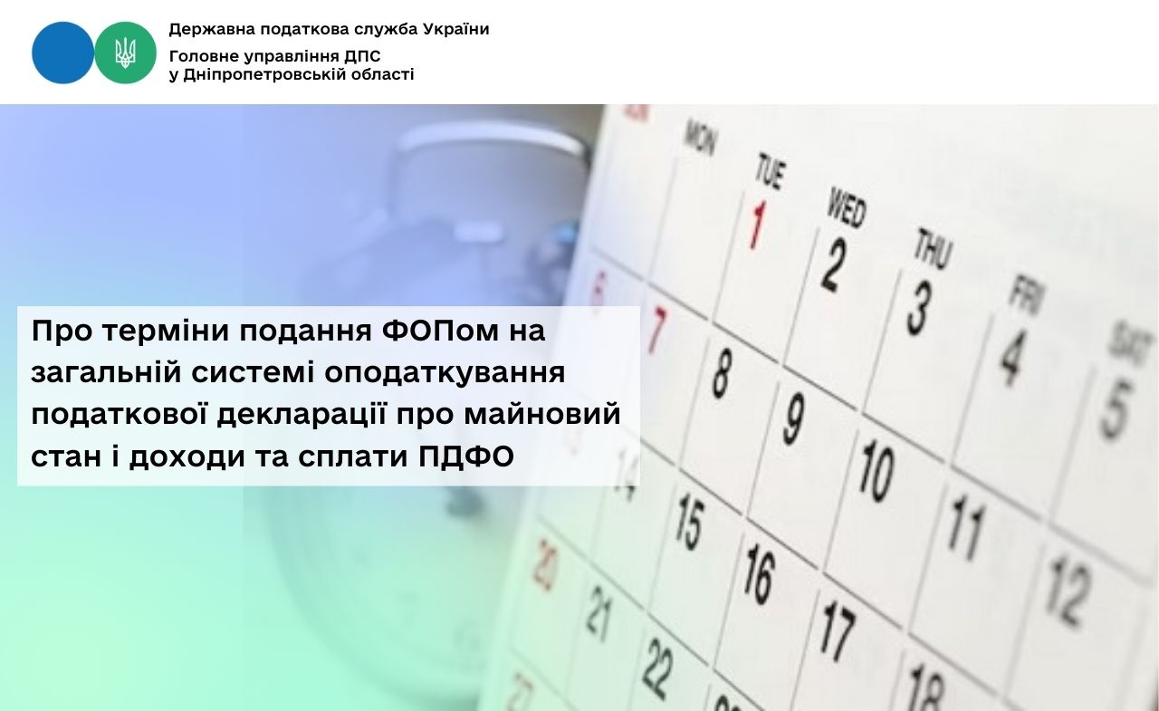 Головне управління ДПС у Дніпропетровській області нагадує, що фізична особа – підприємець (ФОП) на загальній системі оподаткування подає податкову декларацію про майновий стан і доходи (податкова декларація) за базовий звітний (податковий) період, що дорівнює календарному року до 1 травня року, що настає за звітним.