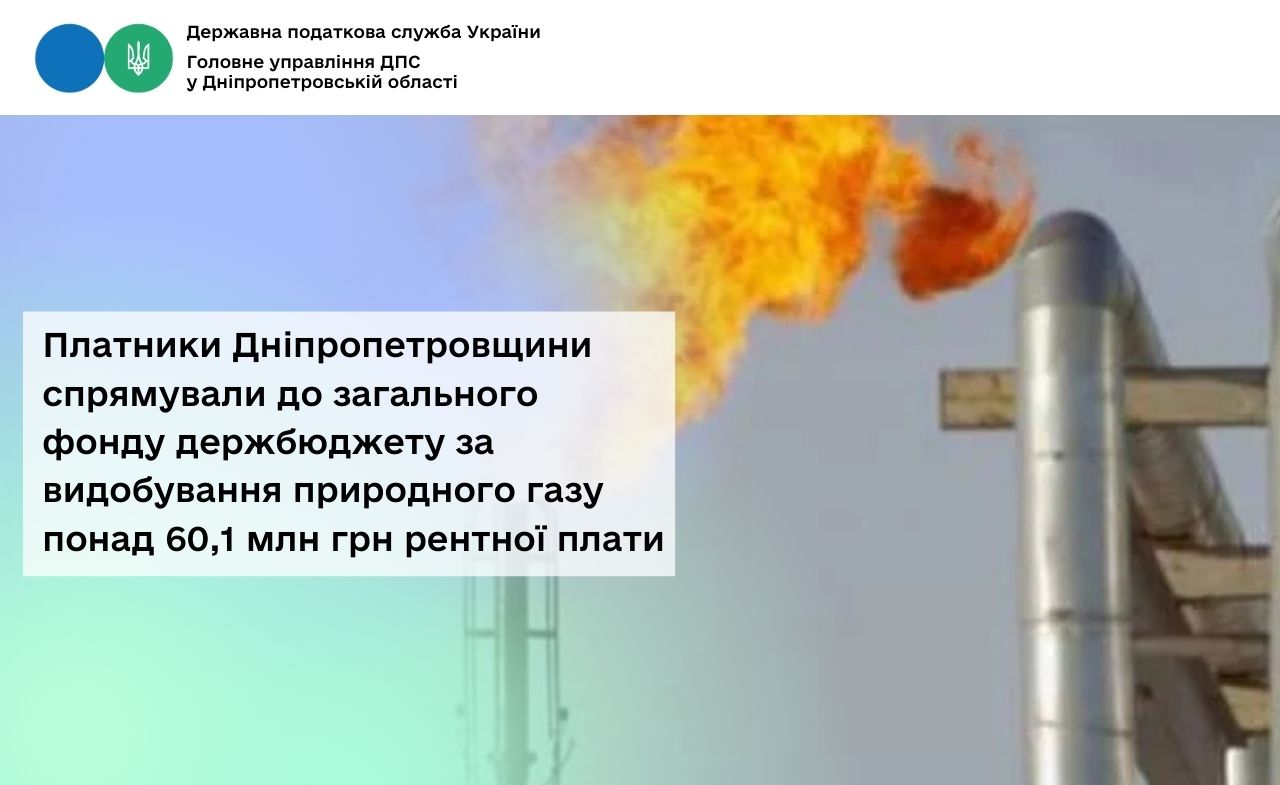 Платники Дніпропетровщини спрямували до загального фонду держбюджету за видобування природного газу понад 60,1 млн грн рентної плати