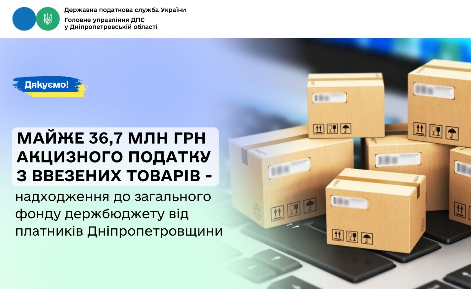 У першому місяці 2026 року від платників Дніпропетровщини до загального фонду державного бюджету з ввезених товарів надійшло майже 36,7 млн грн акцизного податку. Як повідомив в. о. начальника Головного управління ДПС у Дніпропетровській області Юрій Павлютін, це на понад 7,9 млн грн, або на 27,5 відс., більше ніж за результатами січня минулого року.