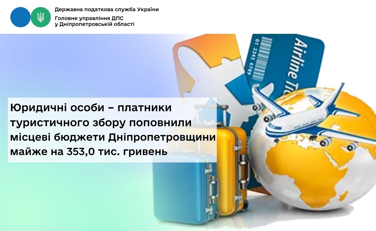 Протягом січня 2026 року до місцевих бюджетів Дніпропетровщини від юридичних осіб надійшло майже 353,0 тис. грн туристичного збору.