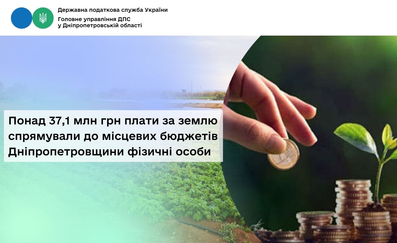 Понад 37,1 млн грн плати за землю спрямували до місцевих бюджетів Дніпропетровщини фізичні особи