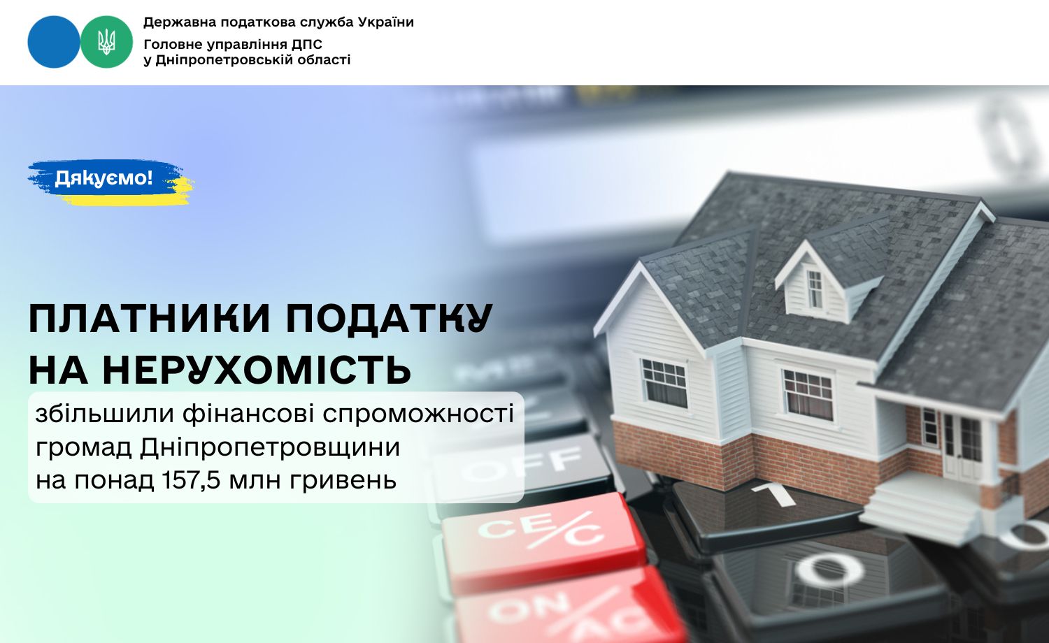 Упродовж січня поточного року до місцевих бюджетів Дніпропетровщини від платників надійшло понад 157,5 млн грн податку на нерухоме майно, відмінне від земельної ділянки (податок на нерухомість). Як зауважив в. о. начальника Головного управління ДПС у Дніпропетровській області Юрій Павлютін, надходження збільшились на понад 21,9 млн грн, або на 16,2 відсотків.