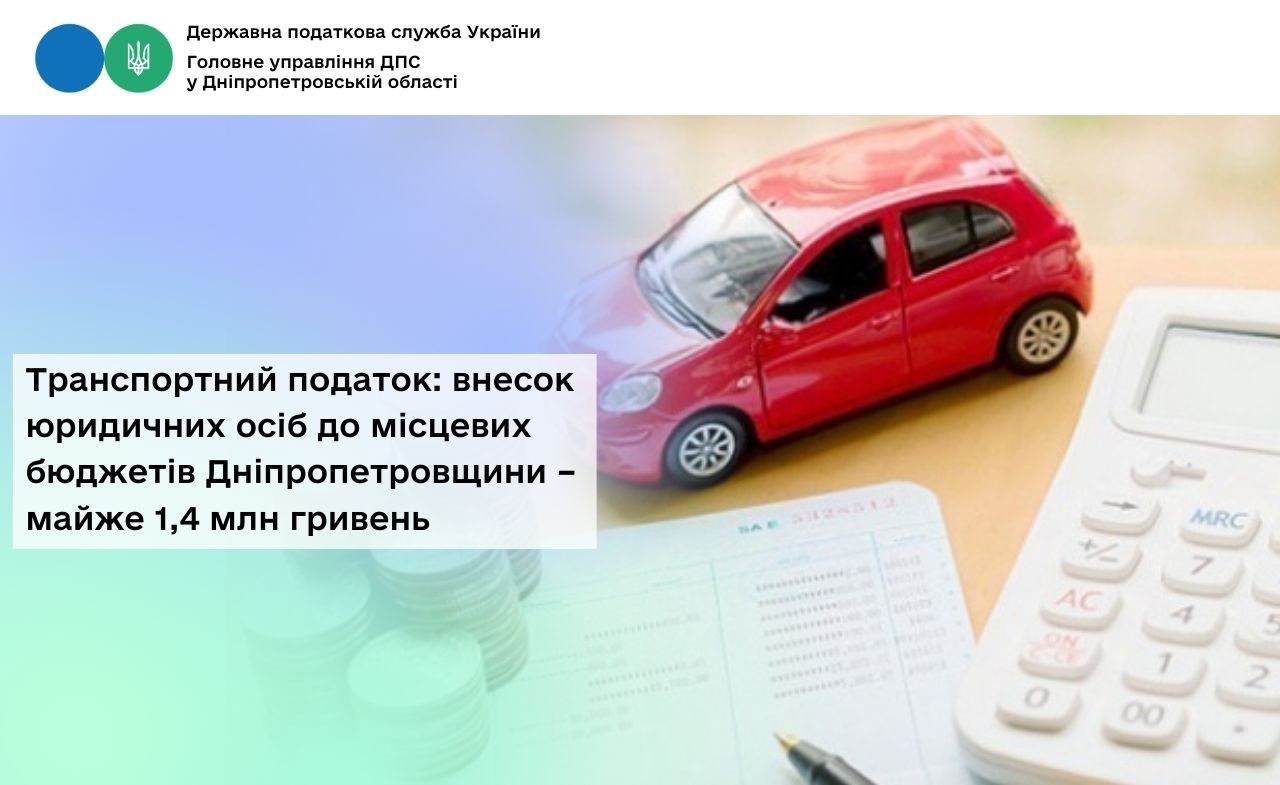 Протягом січня 2026 року до місцевих бюджетів Дніпропетровщини від юридичних осіб – платників транспортного податку надійшло майже 1,4 млн гривень. Надходження зросли на 7,2 відс., або на 93,6 тис. грн у порівнянні з першим місяцем 2025 року.