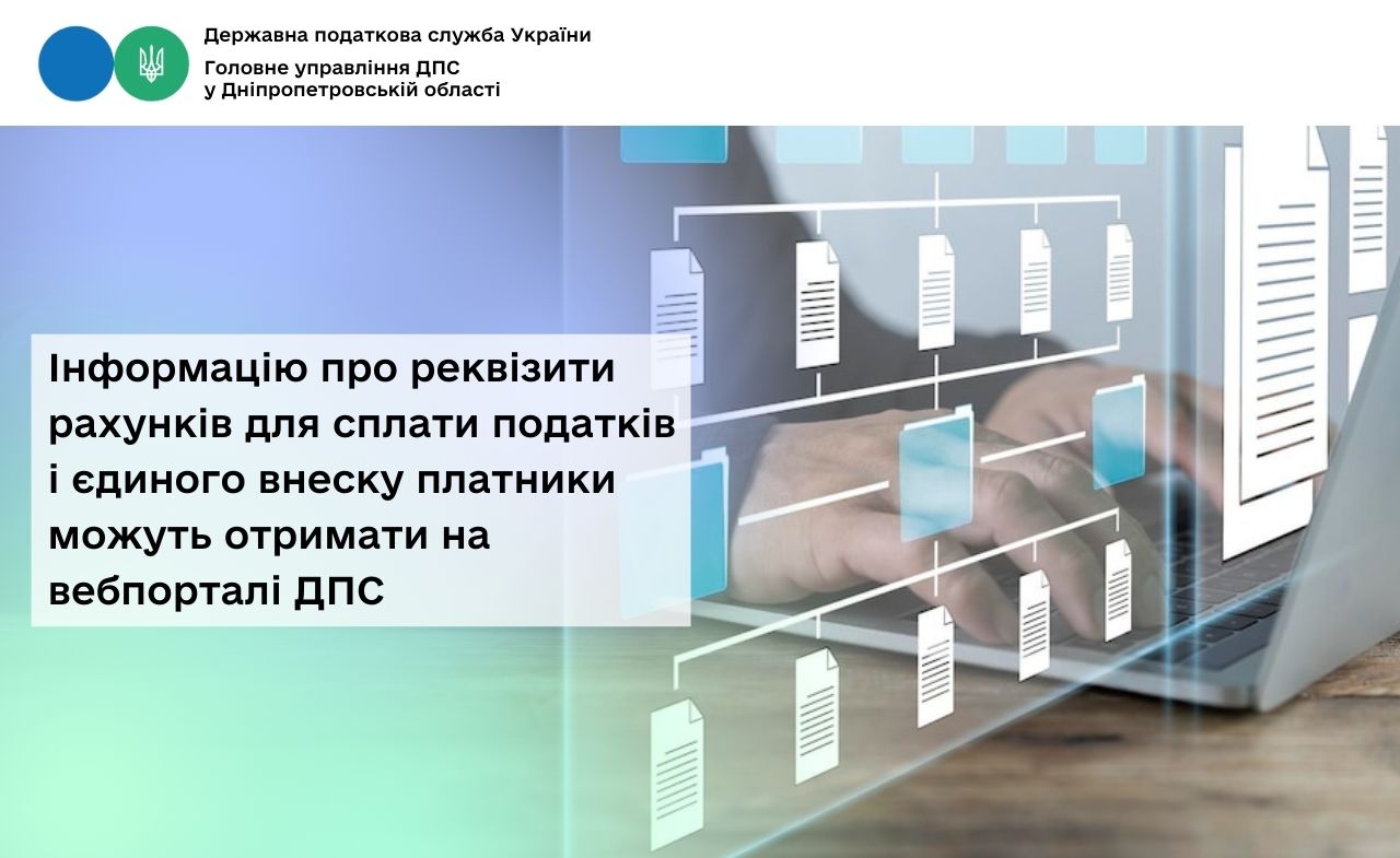 Головне управління ДПС у Дніпропетровській області звертає увагу, що інформацію про реквізити рахунків, відкритих для зарахування податків, а також для сплати єдиного внеску платники податків можуть отримати у рубриці «Рахунки для сплати платежів» на вебпорталі ДПС.