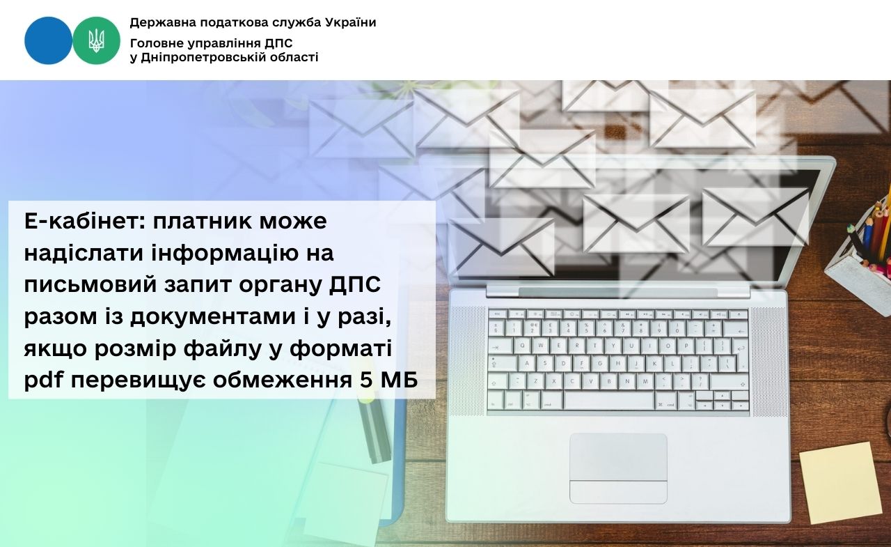 У разі якщо загальний розмір файлу у форматі pdf перевищує обмеження у 5 МБ, відповідна інформація може бути надіслана послідовно, в одному часовому проміжку, частинами, кожна з яких не повинна перевищувати встановлений обсяг, із зазначенням в реквізиті «Короткий зміст» меню «Листування з ДПС» приватної частини Е-кабінету номеру та дати запиту органу ДПС, на який надається відповідь.