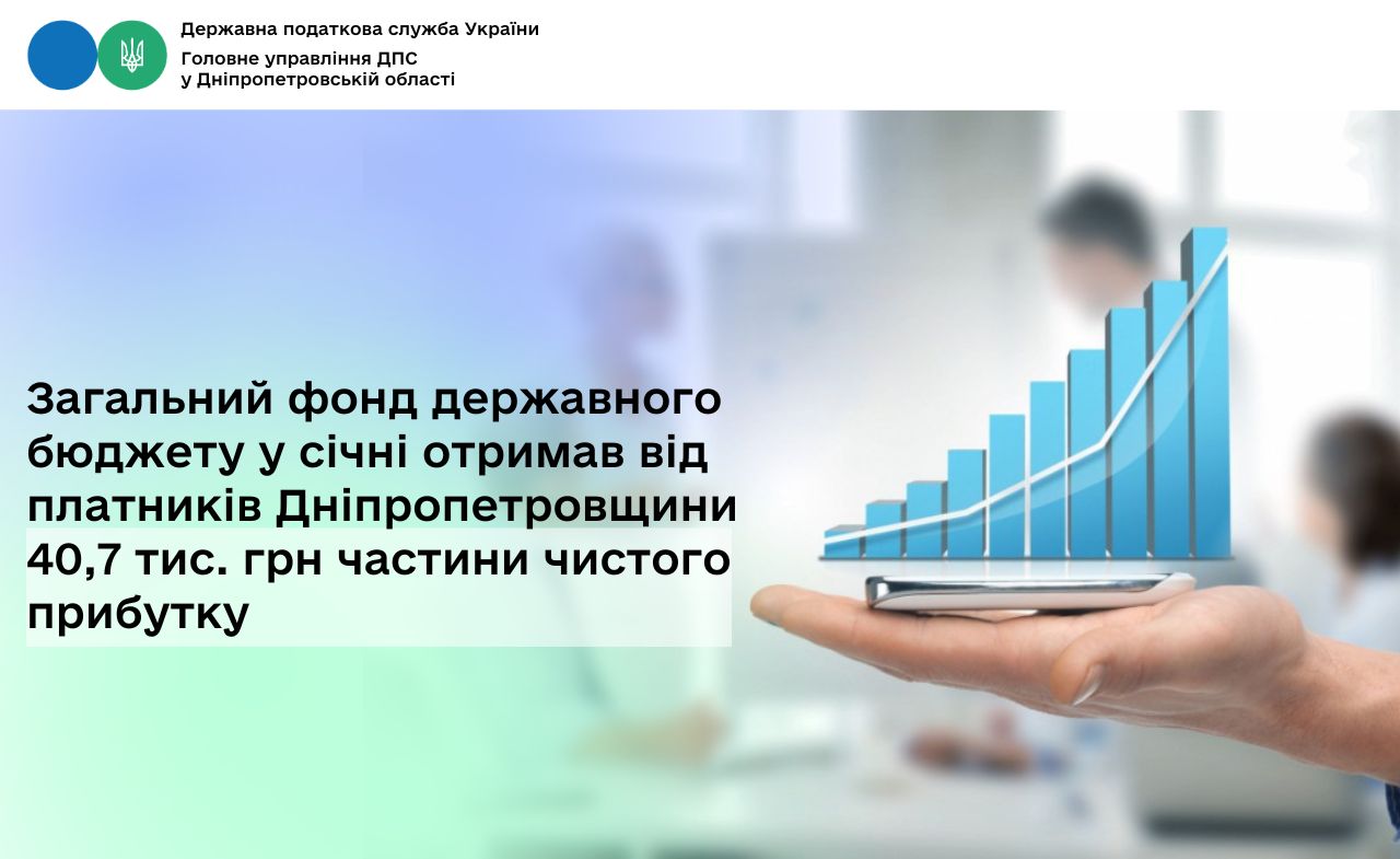 У січні 2026 року від платників Дніпропетровщини до загального фонду державного бюджету надійшло 40,7 тис. грн частини чистого прибутку.