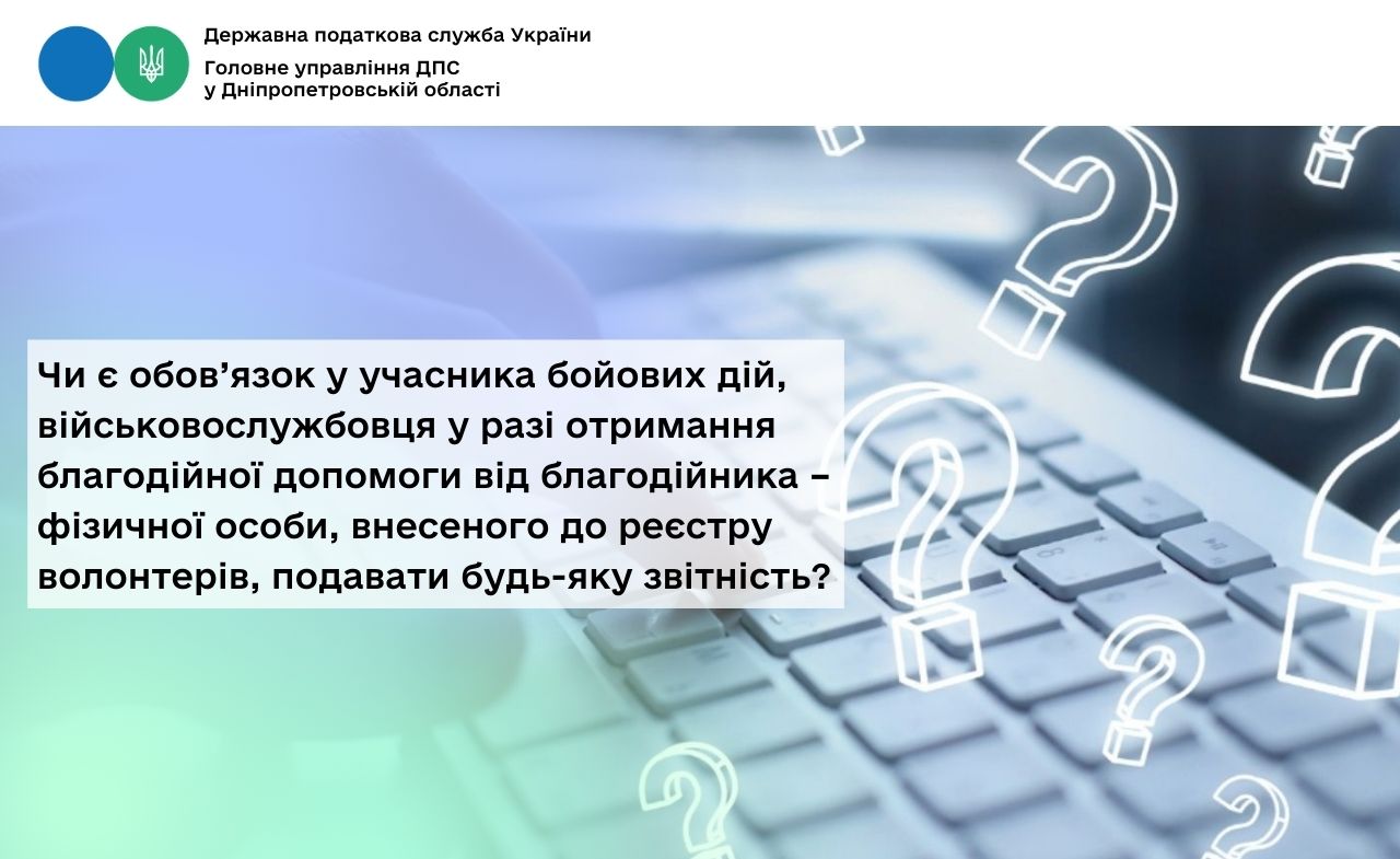 У разі отримання благодійної допомоги платник податку на доходи фізичних осіб (податок) – учасник бойових дій, військовослужбовець (резервіст, військовозобов’язаний) від благодійника – фізичної особи, внесеного до Реєстру волонтерів антитерористичної операції та/або здійснення заходів із забезпечення національної безпеки і оборони, відсічі і стримування збройної агресії Російської Федерації (далі – Реєстр волонтерів) не зобов’язаний подавати річну податкову декларацію про майновий стан і доходи (податкову декларацію) відповідно до Податкового кодексу України (Кодекс).