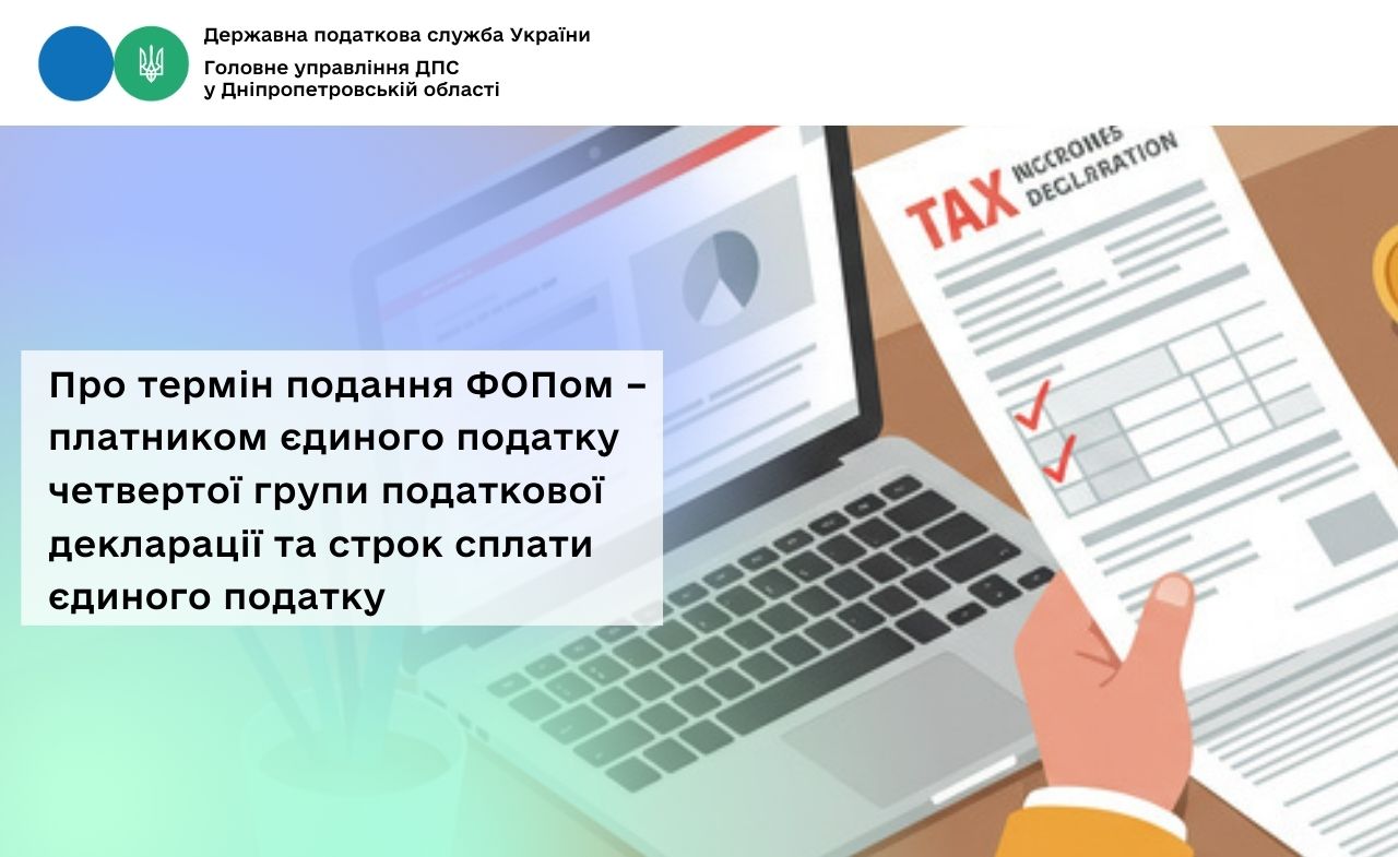 Головне управління ДПС у Дніпропетровській області нагадує, що згідно з абзацом сьомим п.п. 298.8.1 п. 298.8 ст. 298 Податкового кодексу України (далі – ПКУ) фізичні особи – підприємці (ФОП), які подали заяву про обрання ними спрощеної системи оподаткування та ставки єдиного податку, встановленої для четвертої групи, вперше подають визначену п.п. 298.8.1 п. 298.8 ст. 298 ПКУ звітність протягом 20 календарних днів з дня подання такої заяви.