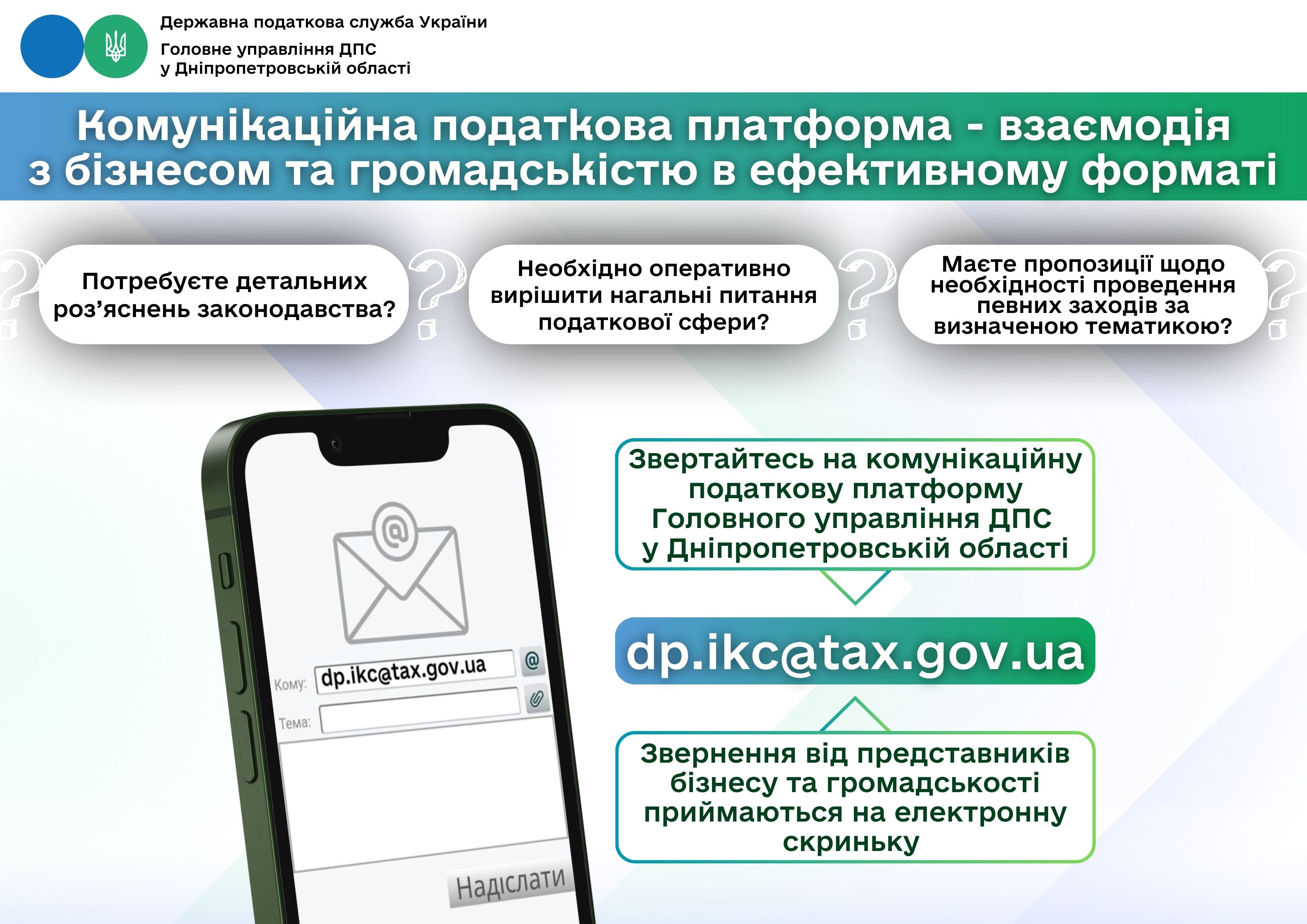 Звернення від представників бізнесу та громадськості приймаються на електронну скриньку dp.ikc@tax.gov.ua.