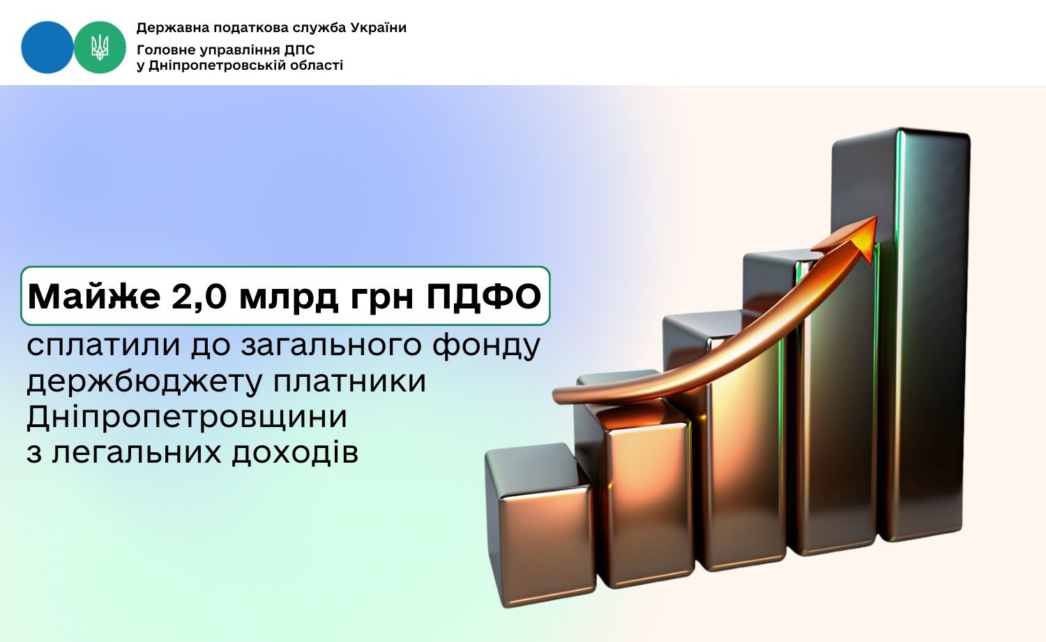 У січні – лютому 2026 року надходження податку на доходи фізичних осіб (ПДФО) від платників Дніпропетровщини до загального фонду державного бюджету склали понад 1 965,4 млн гривень. Як зазначив в. о. начальника Головного управління ДПС у Дніпропетровській області Юрій Павлютін, це на понад 267,8 млн грн, або на 15,8 відс., більше ніж за результатами січня – лютого минулого року.