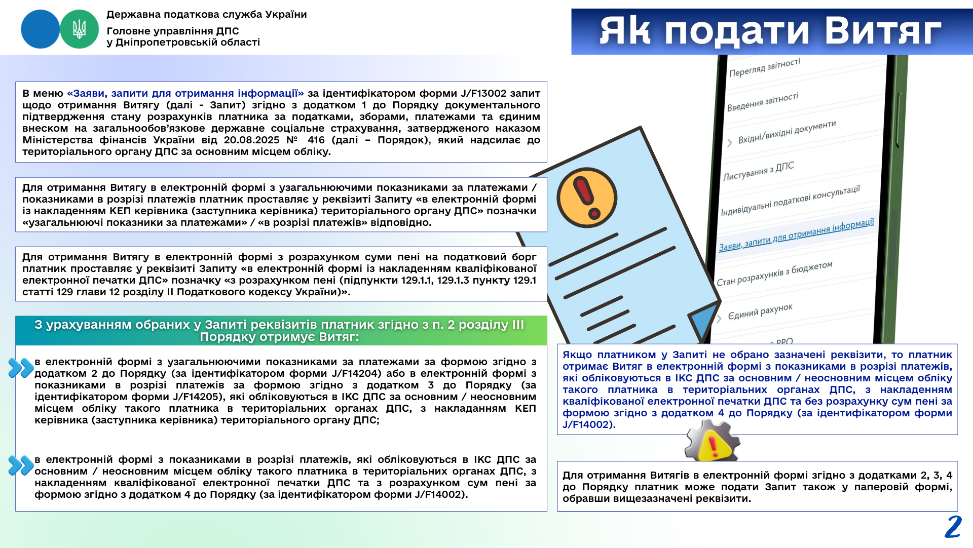 В меню «Заяви, запити для отримання інформації» за ідентифікатором форми J/F13002 запит щодо отримання Витягу (далі - Запит) згідно з додатком 1 до Порядку документального підтвердження стану розрахунків платника за податками, зборами, платежами та єдиним внеском на загальнообов’язкове державне соціальне страхування, затвердженого наказом Міністерства фінансів України від 20.08.2025 № 416 (далі – Порядок), який надсилає до територіального органу ДПС за основним місцем обліку.