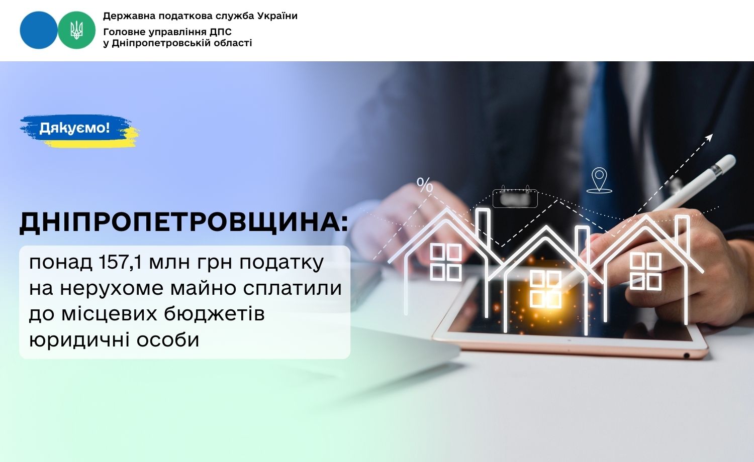 Від юридичних осіб – платників податку на нерухоме майно, відмінне від земельної ділянки (далі – податок), до місцевих бюджетів Дніпропетровщини впродовж січня – лютого 2026 року надійшло понад 157,1 млн гривень. Надходження зросли у порівнянні з січнем – лютим минулого року на понад 21,7 млн грн, або на 16,1 відсотків. Про це повідомив в. о. начальника Головного управління ДПС у Дніпропетровській області Юрій Павлютін.