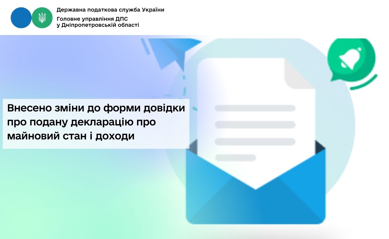 Головне управління ДПС у Дніпропетровській області інформує, що наказом Міністерства фінансів України від 28.11.2025 № 601 (зареєстровано в Міністерстві юстиції України 02 грудня 2025 року за № 1794/45200) (далі – Наказ № 601) внесено зміни до наказу Міністерства фінансів України від 07.11.2025 № 560 «Про внесення змін до форми довідки про подану декларацію про майновий стан і доходи (про сплату або відсутність податкових зобов’язань) та Порядку оформлення і видачі довідки про подану декларацію про майновий стан і доходи (про сплату або відсутність податкових зобов’язань)» (зареєстровано у Міністерстві юстиції України 24 листопада 2025 року за № 1738/45144)