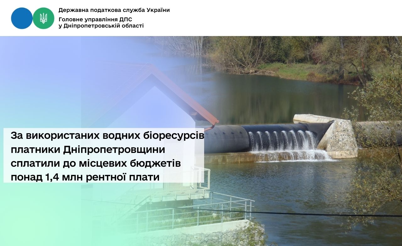 Упродовж січня – лютого 2026 року платники рентної плати за використання водних біоресурсів сплатили до місцевих бюджетів Дніпропетровської області понад 1,4 млн гривень. Надходження зросли порівняно з січнем – лютим 2025 року на 146,2 тис. грн, темп росту – 111,3 відсотки.