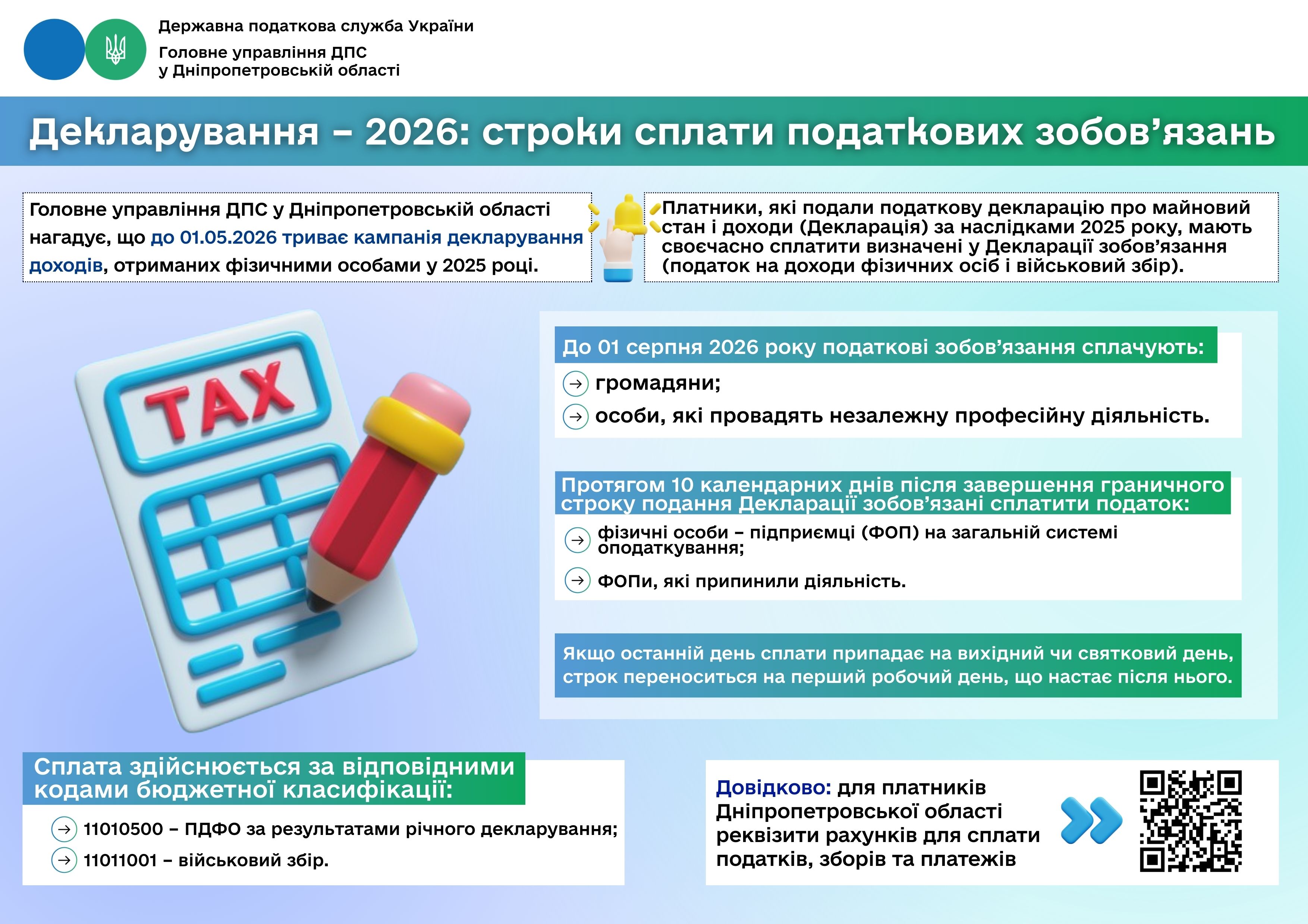 Головне управління ДПС у Дніпропетровській області нагадує, що до 01.05.2026 триває кампанія декларування доходів, отриманих фізичними особами у 2025 році.