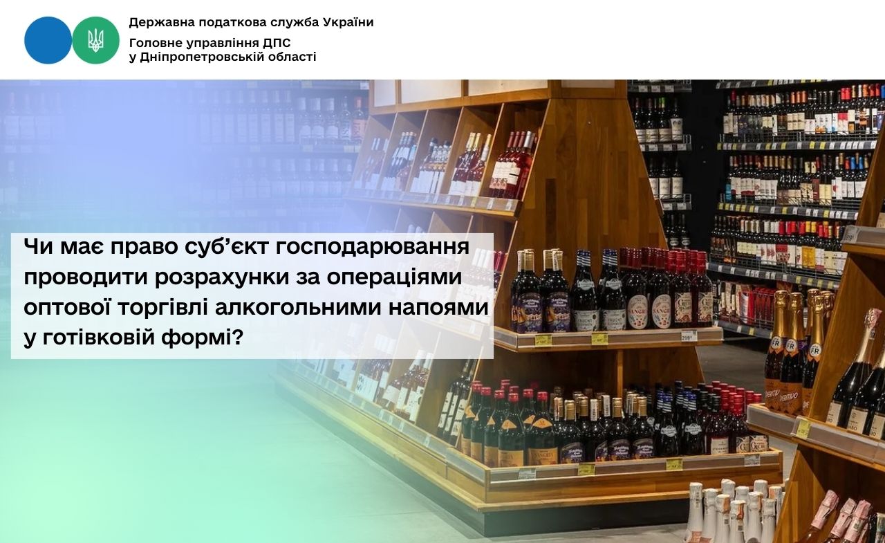 Головне управління ДПС у Дніпропетровській області звертає увагу, що згідно з частиною першою ст. 19 Закону України від 18 червня 2024 року № 3817-IX «Про державне регулювання виробництва і обігу спирту етилового, спиртових дистилятів, біоетанолу, алкогольних напоїв, тютюнових виробів, тютюнової сировини, рідин, що використовуються в електронних сигаретах, та пального» (зі змінами і доповненнями) (далі – Закон № 3817) суб’єкти господарювання при здійсненні діяльності з оптової торгівлі спиртом етиловим, спиртовими дистилятами, біоетанолом, алкогольними напоями зобов’язані проводити розрахунки за операціями оптової торгівлі спиртом етиловим, спиртовими дистилятами, біоетанолом, алкогольними напоями виключно у безготівковій формі, в тому числі у випадках, якщо розрахунки проводяться з іншою особою після заміни сторони у зобов’язанні чи при виконанні обов’язку боржника третьою особою.