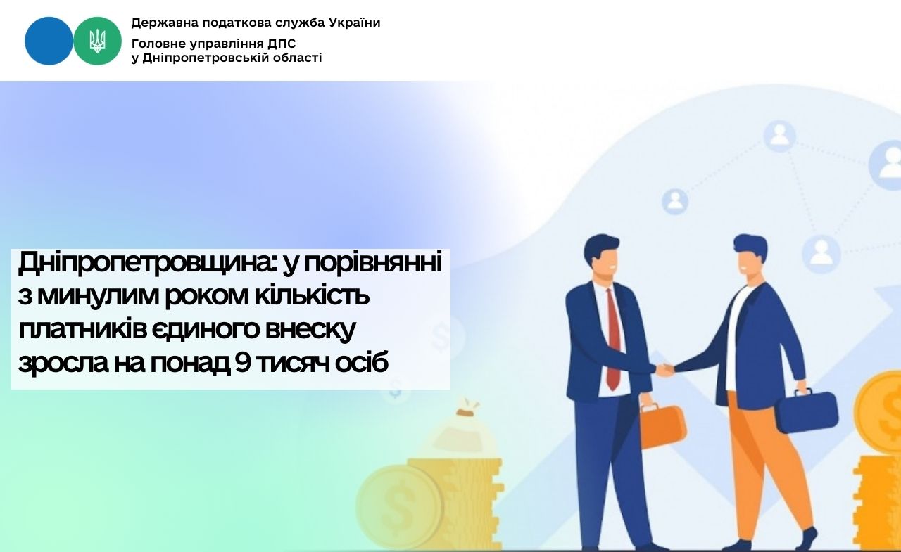 Станом на 01.03.2026 в Головному управлінні ДПС у Дніпропетровській області обліку знаходилось 290 935 юридичних осіб і фізичних осіб – підприємців – платників єдиного внеску на загальнообов’язкове державне соціальне страхування (єдиний внесок). Кількість таких осіб зросла у порівнянні з 2025 роком на 9 237 осіб (станом на 01.03.2025 – 281 698 осіб).