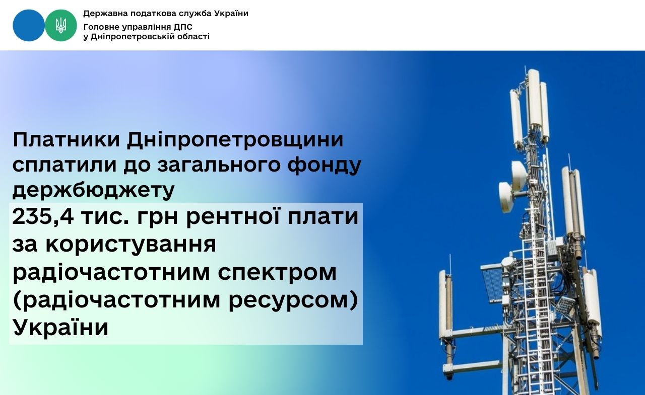 Протягом січня – лютого 2026 року платники Дніпропетровщини за користування радіочастотним спектром (радіочастотним ресурсом) України спрямували до загального фонду державного бюджету 235,40 тис. грн рентної плати. Це більше ніж у минулому році на 15,8 тис. грн, темп росту – 107,2 відсотки.