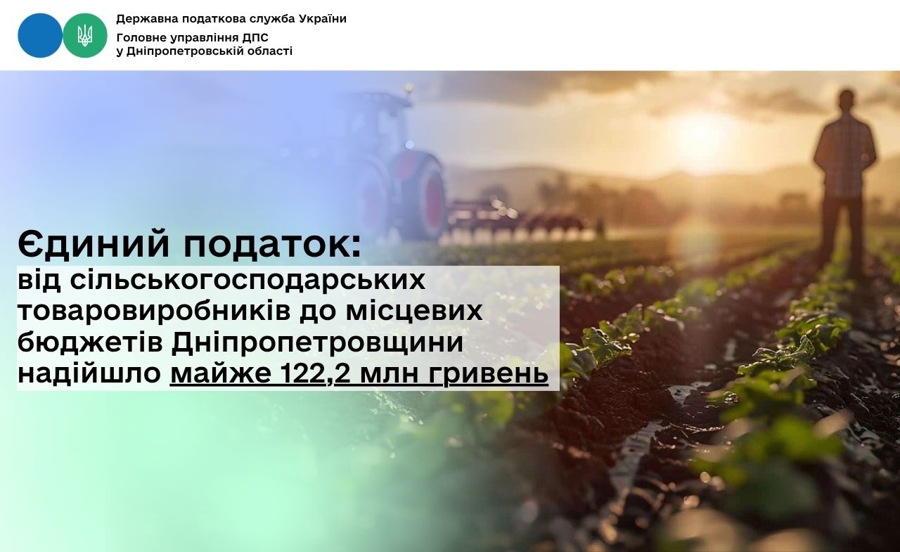 Протягом січня – лютого 2026 року до місцевих бюджетів Дніпропетровської області від сільськогосподарських товаровиробників – платників єдиного податку надійшло майже 122,2 млн гривень. Це більше ніж у аналогічному періоді минулого року на понад 7,4 млн гривень.